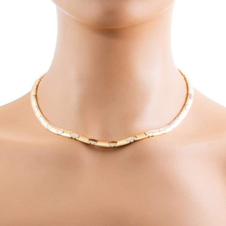 Collar-style gold necklace. 14ct yellow and white gold. Inner circumference: 42cm. Width: 5.2mm. Weight: 22.4g. (Pre-owned)