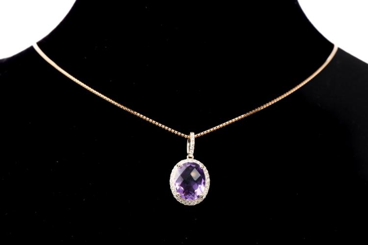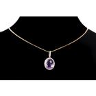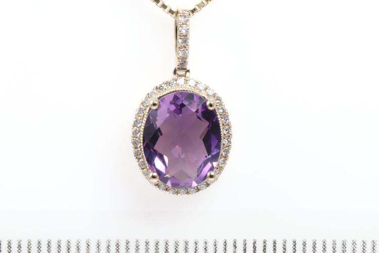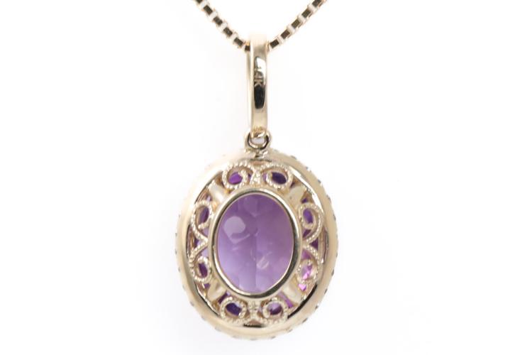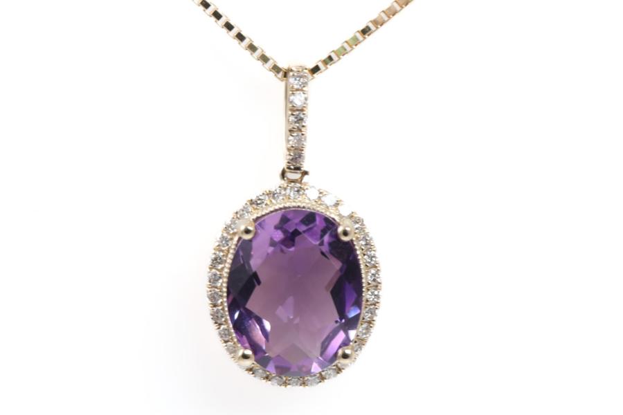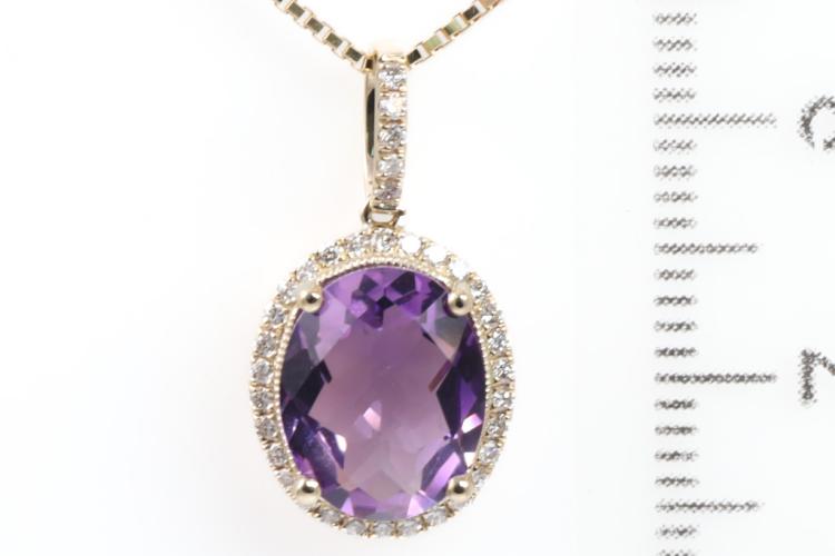 Amethyst and Diamond pendant with oval checkerboard cut natural Amethyst totalling 2.00ct and natural Diamonds totalling 0.16ct. 14ct yellow gold with 18ct yellow gold adjustable 44cm chain. Weight: 3.4g. (New)