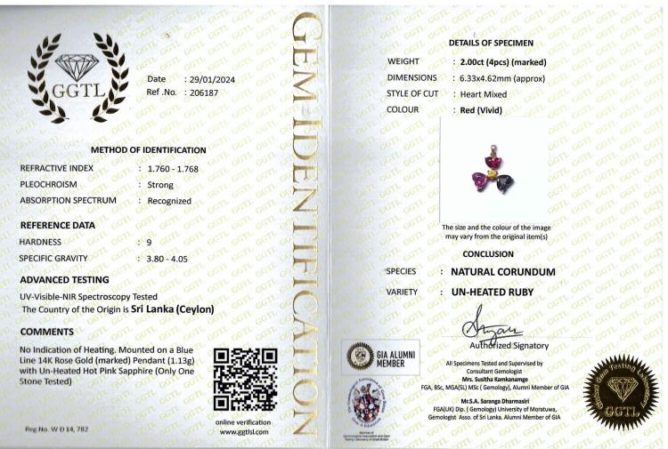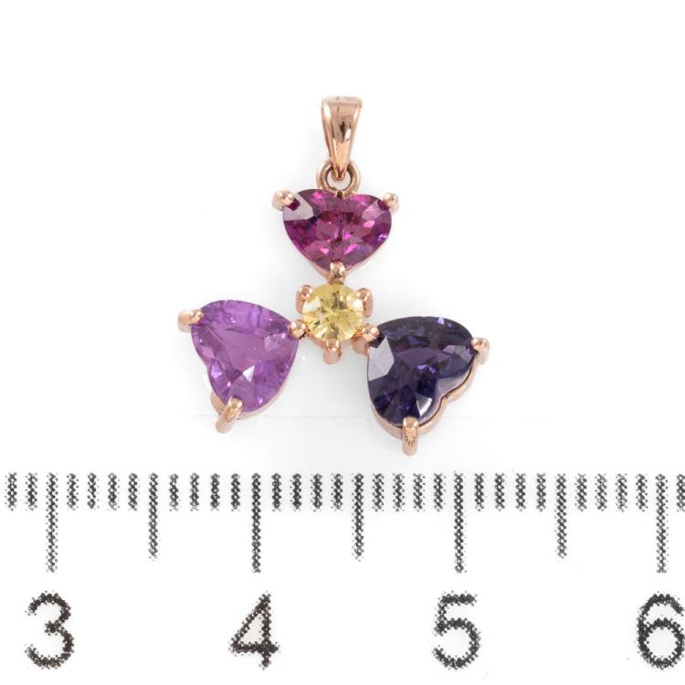 Pendant with heart shape natural unheated Ceylon Ruby and round & heart shape multi-colour natural Sapphires totalling 2.00ct (Note - only one hot pink Sapphire tested). 14ct rose gold. No chain provided. Weight: 1.1g. With GGTL Report #206187. (As new)