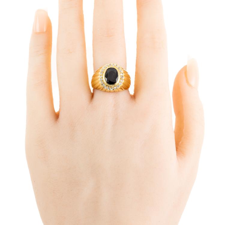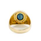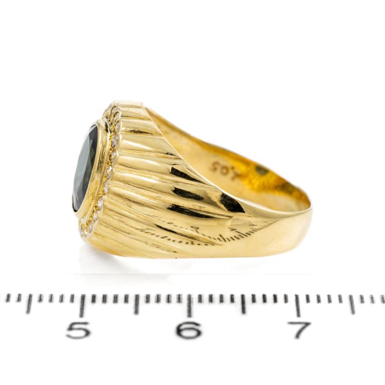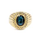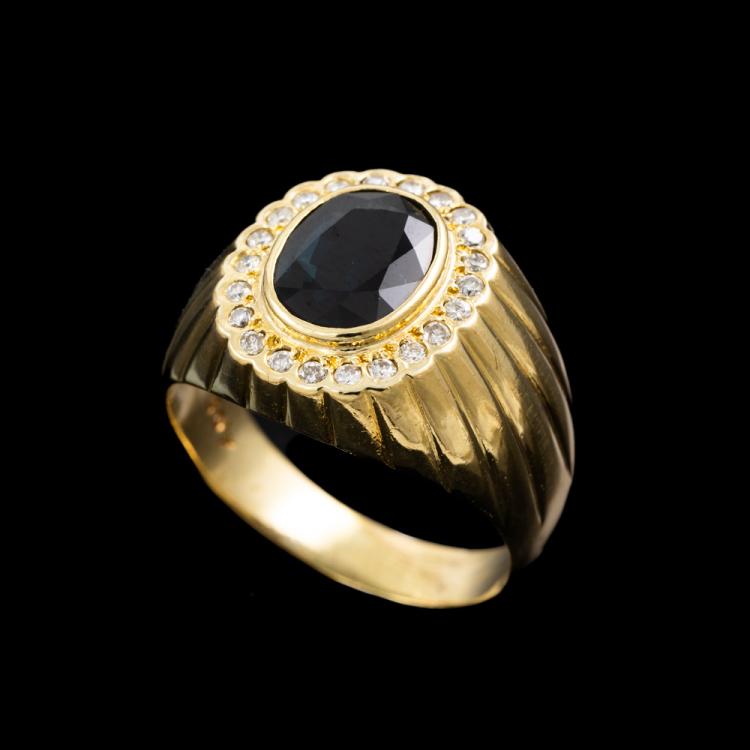 Mens ring with oval dark greenish blue Natural Sapphire of 2.05ct and round Natural Diamonds totalling 0.34cts (Estimated grading: G-H SI-P1. 18ct yellow gold. Ring size P1/2. Band width: 4mm - 5.9mm. Note, ring band with a minor crack. Weight: 7.1g. (Pre-owned)