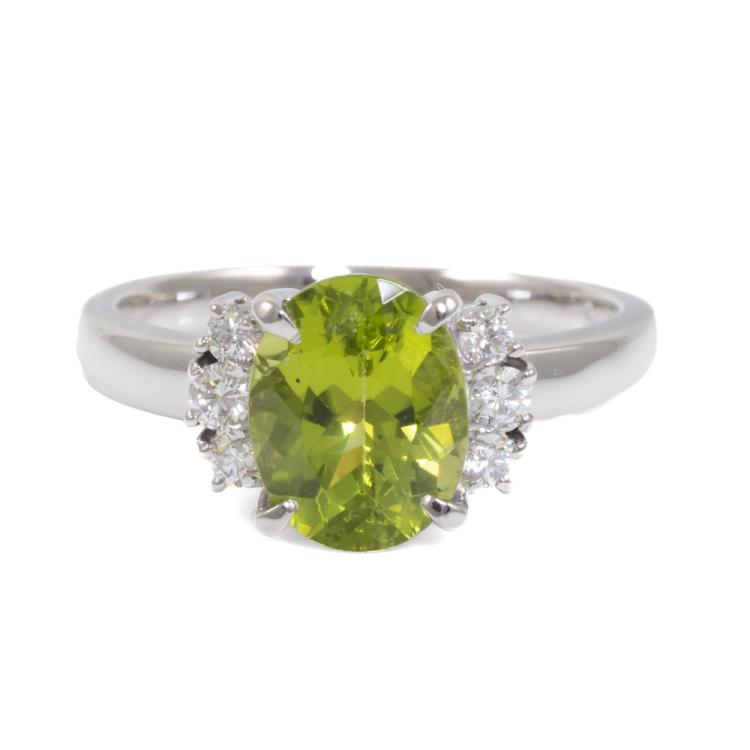 Peridot and Diamond ring with oval shape natural Peridot of 2.09ct and round natural Diamonds totalling 0.17ct. Platinum 900. Ring size K1/2. Band width: 2mm - 2.7mm. Weight: 4.8g. (Pre-owned)