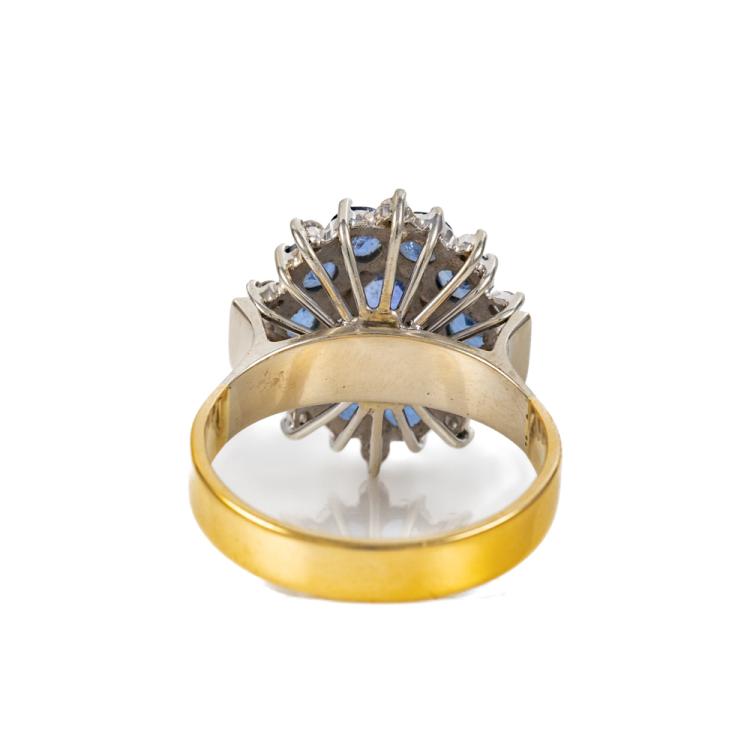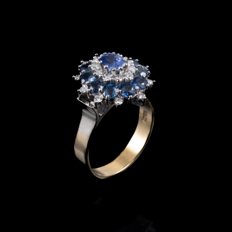 Sapphire and Diamond ring with round & oval shape blue natural Sapphires totalling 2.95cts and round natural Diamonds totalling approximately 0.55cts (Estimated grading: H VS-SI). 18ct yellow & white gold. Weight: 7.5g. Ring size Q1/2. Band width: 3.8mm. With copy of GSL Valuation #AA 63603, item 13. (Pre-owned)^