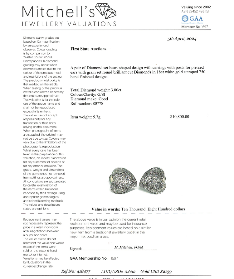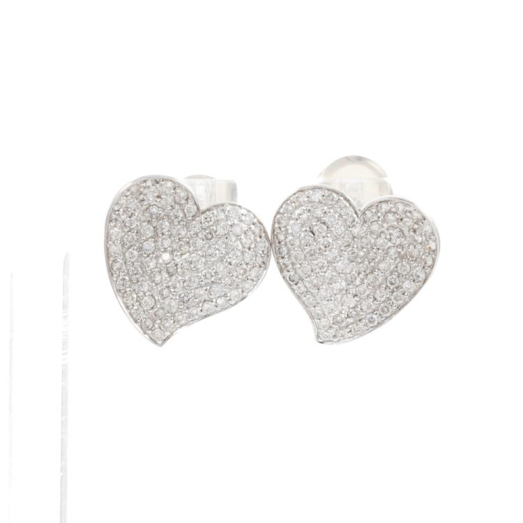 Diamond heart design clip-on earrings (for pierced ears) with round Natural Diamonds totalling 3.00cts (Estimated grading: G SI). 18ct white gold. Weight: 5.7g. With Valuation Certificate #418477. (Pre-owned)