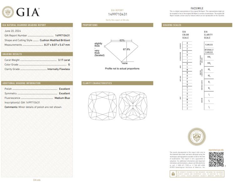 A loose cushion cut Natural Diamond of 3.17ct (with GIA report graded as G Internally Flawless #1499710431). (New)