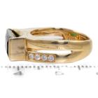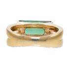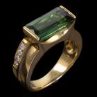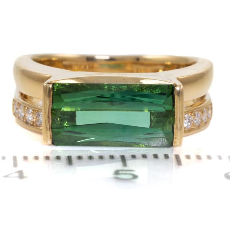 Tourmaline and Diamond ring with emerald cut natural green Tourmaline of 3.17ct and round natural Diamonds totalling 0.11ct. 18ct yellow gold. Ring size I1/2. Minimum band width: 3.3mm. Weight: 7.8g. (Pre-owned)