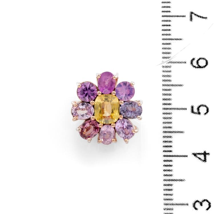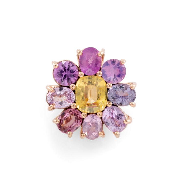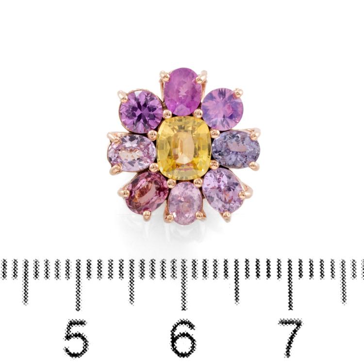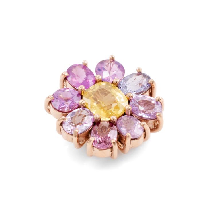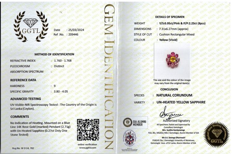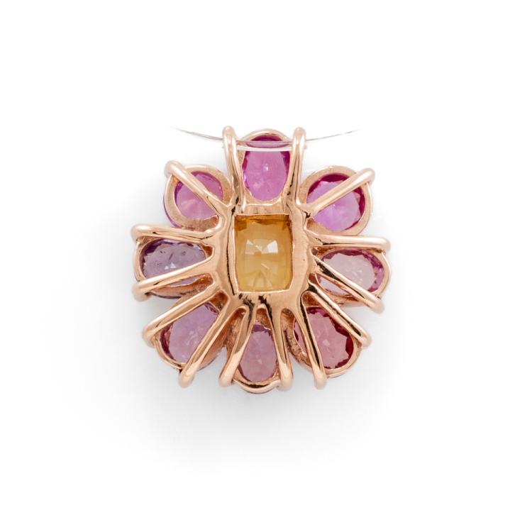 Sapphire pendant with a centre cushion cut unheated Ceylon natural yellow Sapphire of 0.95ct and round & oval shape unheated pink & purple natural Sapphires totalling 2.23ct. 14ct rose gold. Weight: 2.7g. No chain provided. With GGTL Report #209446. (As new)