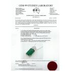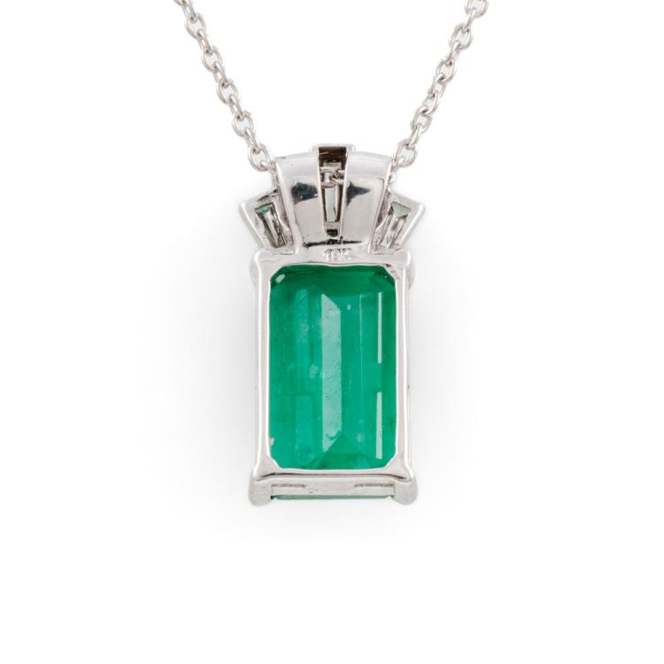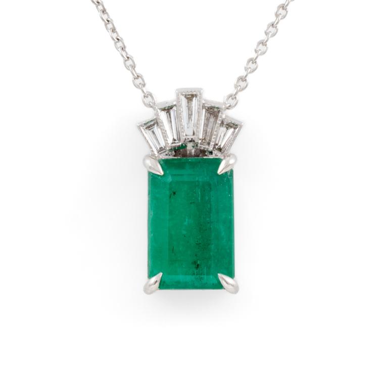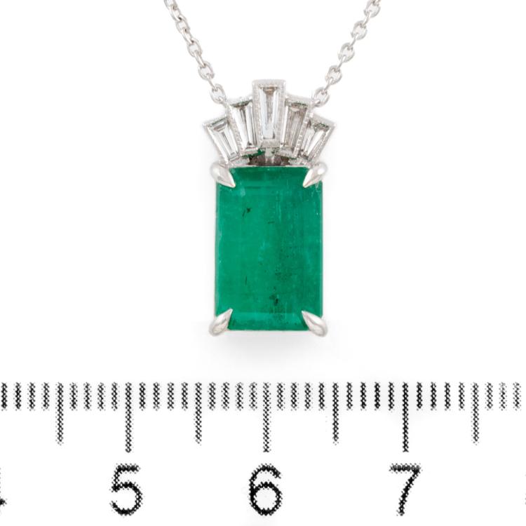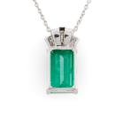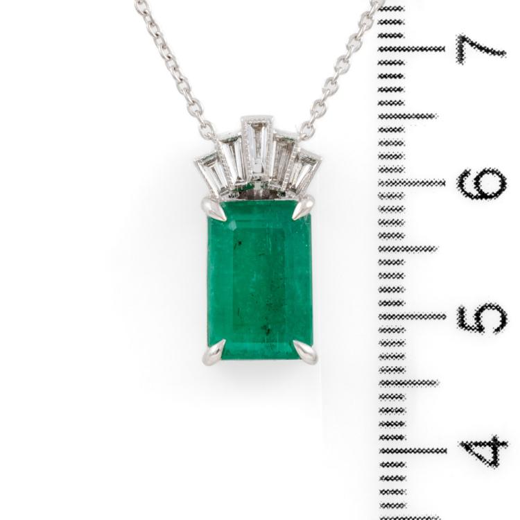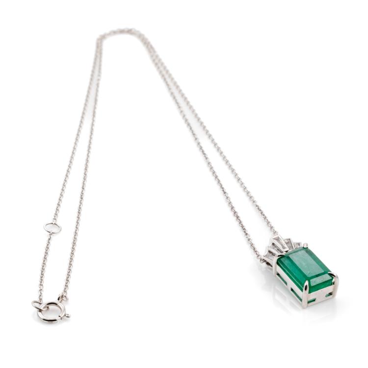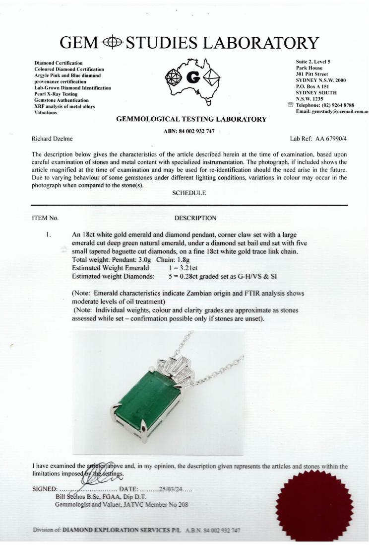 Emerald and Diamond pendant with emerald cut Natural Zambian Emerald of 3.21ct (with GSL Description #AA67990/4) and baguette cut Natural Diamonds totalling 0.28cts. 18ct white gold with adjustable 18ct white gold 45cm chain. Weight: 4.8g (Pre-owned)