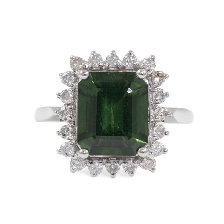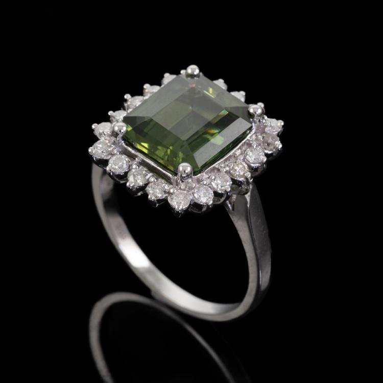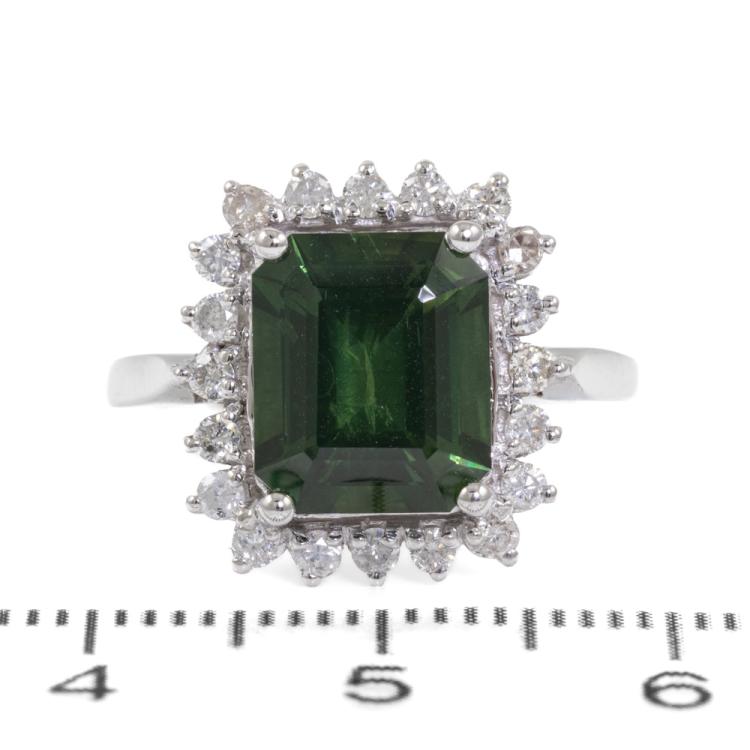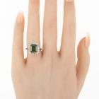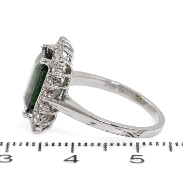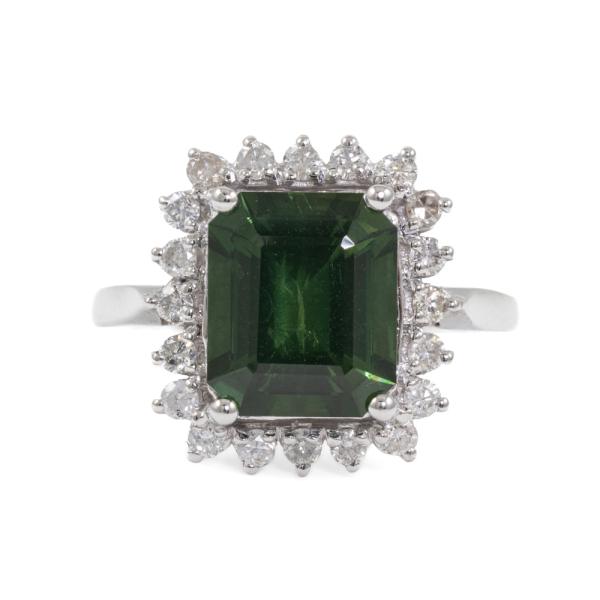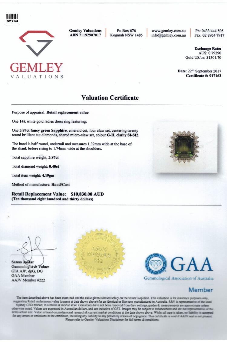 Sapphire and Diamond ring with emerald cut natural green Sapphire of 3.87ct and round natural Diamonds totalling 0.40ct (Estimated grading: G-H SI-P1). 14ct white gold. Ring size: K. Band width: 1.6mm. Weight: 4.2g. With Valuation #917162. (Pre-Owned)
