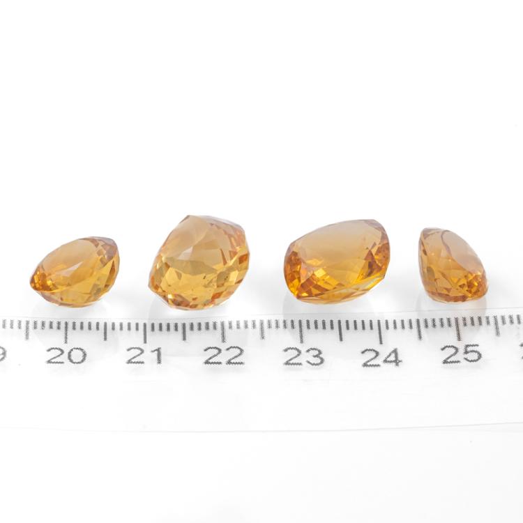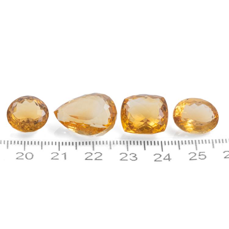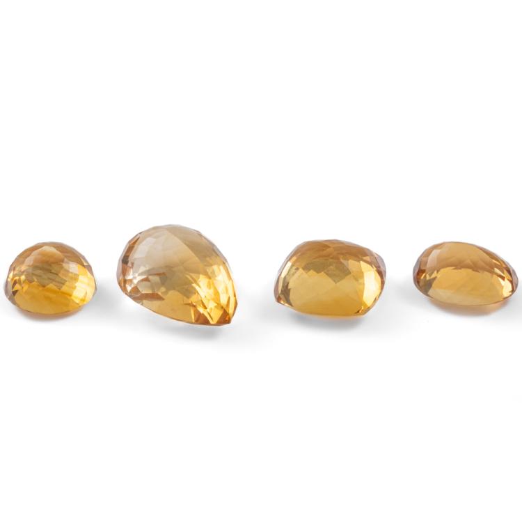 4 Loose Mixed shape Citrine totalling 41.17cts. 1) 10.97ct Cushion Cut Citrine; 14.2mm x 14.1mm x 8.0mm, 2) 16.28ct Pear shape Citrine: 19.4mm x 14.1mm x 9.8mm, 3) 6.87ct Oval Shape Citrine: 13.9mm x 11.1mm x 7.3mm, 4) 7.05ct Round Citrine; 12.3mm x 12.3mm x 7.3mm. (New)
