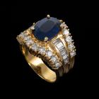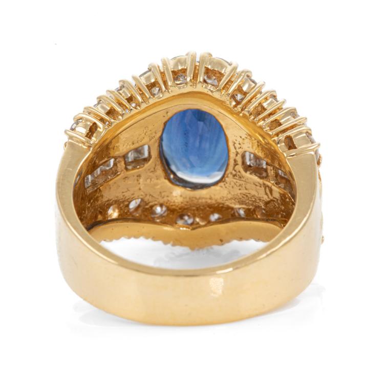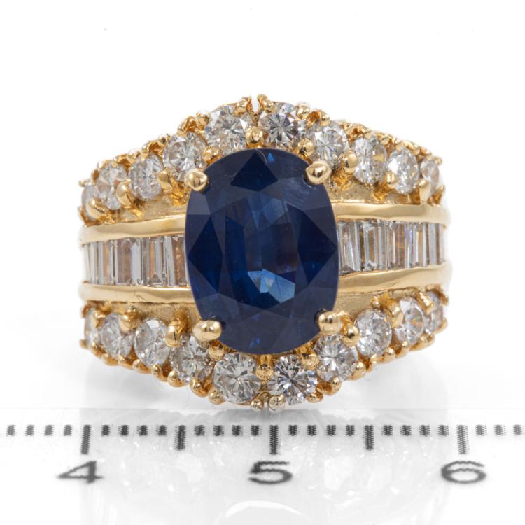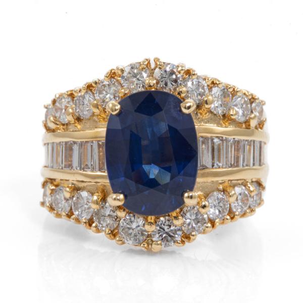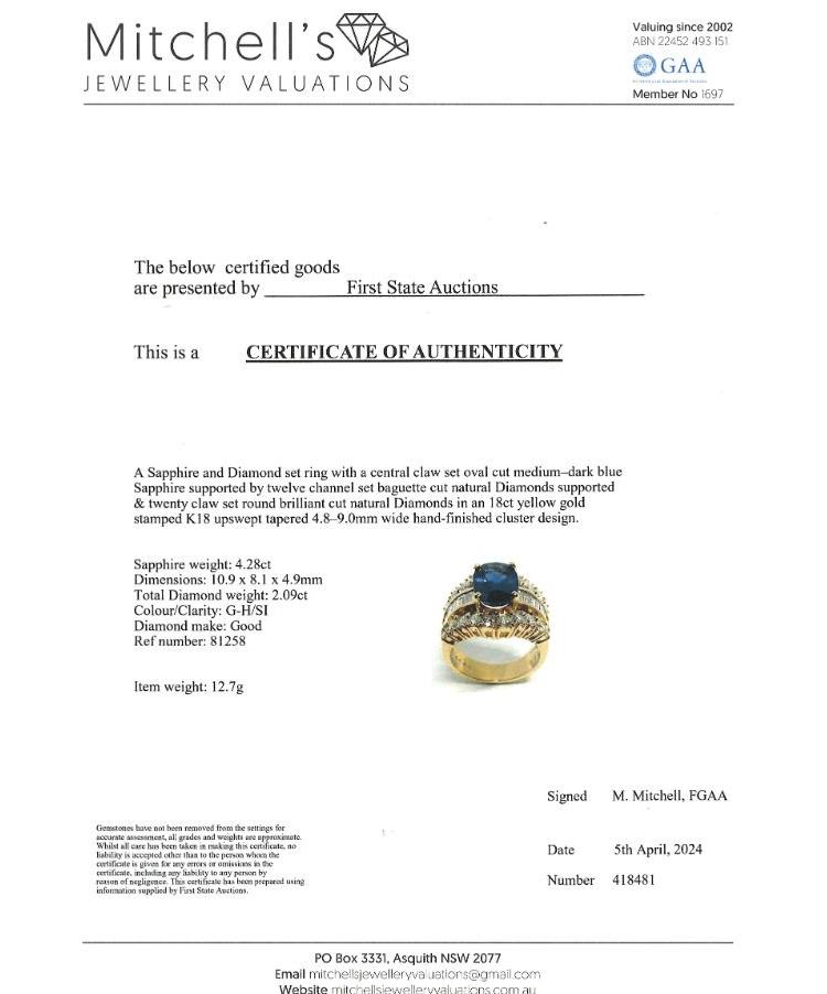 Sapphire and Diamond ring with oval shape natural blue Sapphire of 4.28ct and baguette & round natural Diamonds totalling 2.09cts (Estimated grading: G-H SI). 18ct yellow gold. Ring size M. Band width: 4.8 - 9.0mm. Weight: 12.7g. With certificate #418481. (Pre-owned)