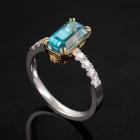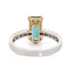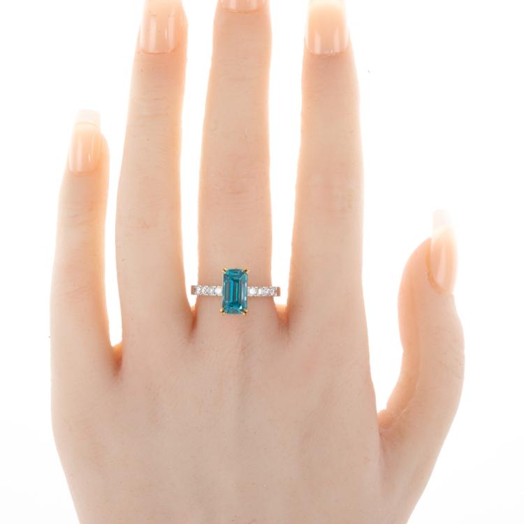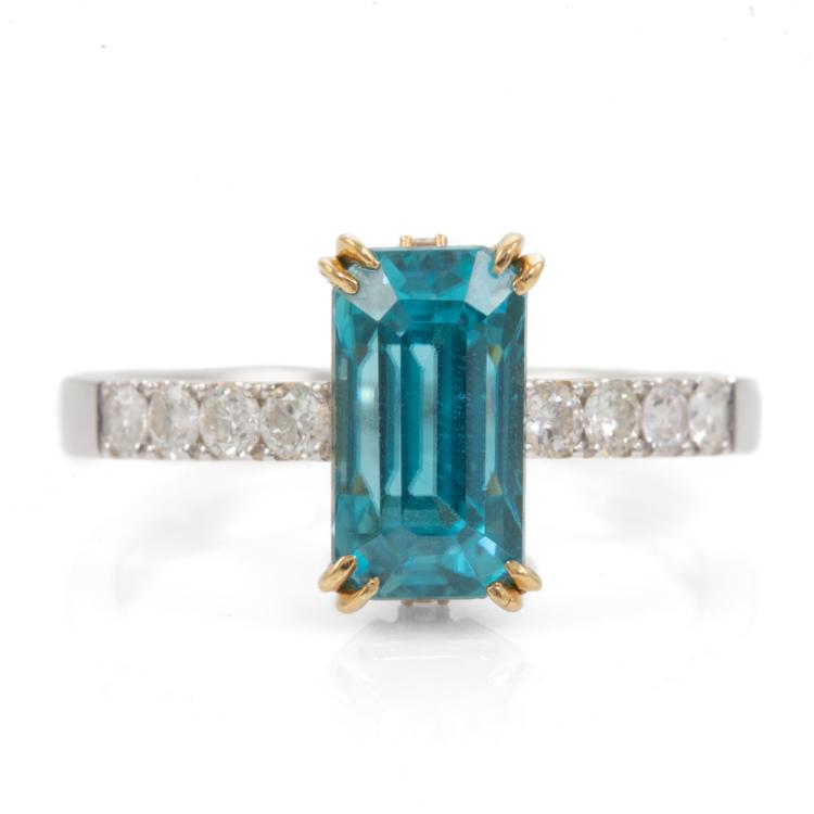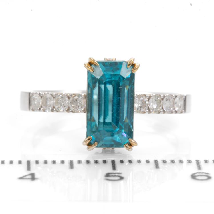 Zircon and Diamond ring with rectangular step cut Natural blue Zircon of 4.69ct (with GSL Gemstone Report #AA66385/2) and round Natural Diamonds totalling approximately 0.24Acts. 18ct white & yellow gold. Ring size P - ring resizing is not recommended. Band width: 2.3mm. Weight: 4.8g (Pre-owned)
