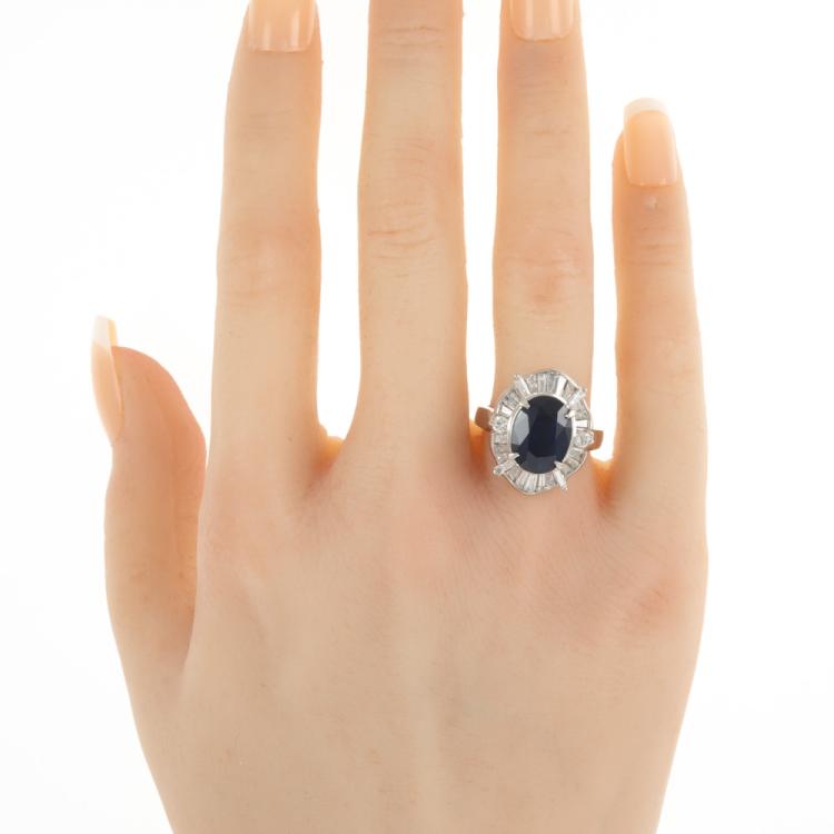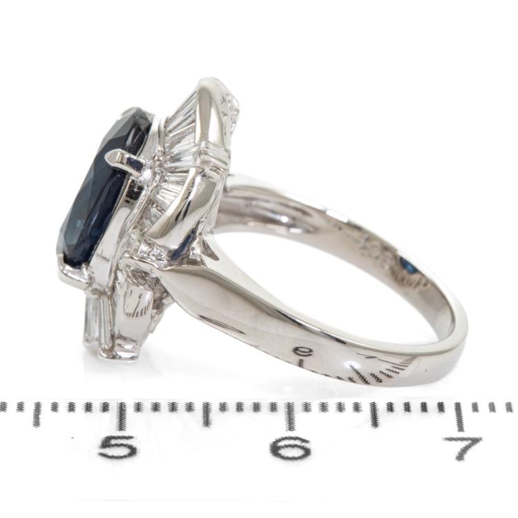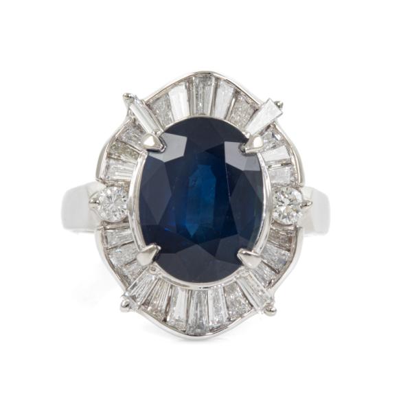 Sapphire and Diamond ring with oval blue natural Sapphire of 4.69ct with round & baguette cut natural Diamonds totalling 1.03ct (Estimated grading: G-I SI-P1). Platinum 900. Ring size L. Band width 3.6mm - 2.4mm. Weight: 10.0g. With Certificate #418758. Pre-owned)