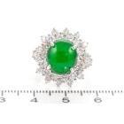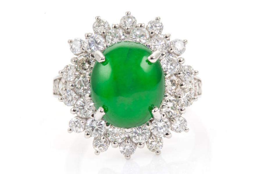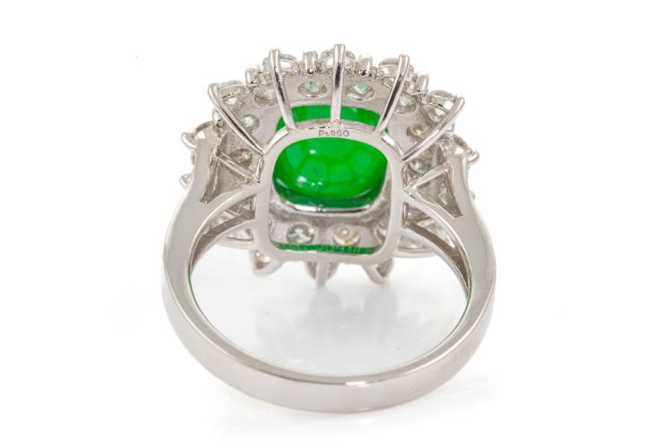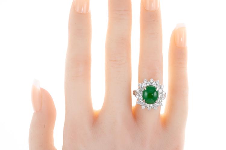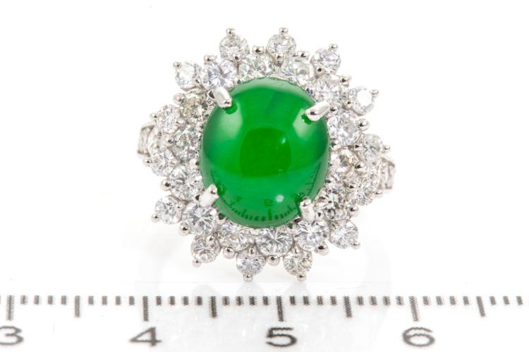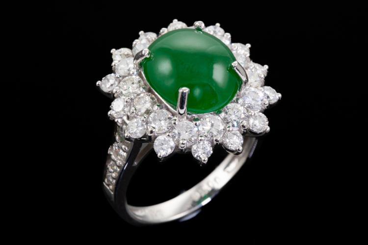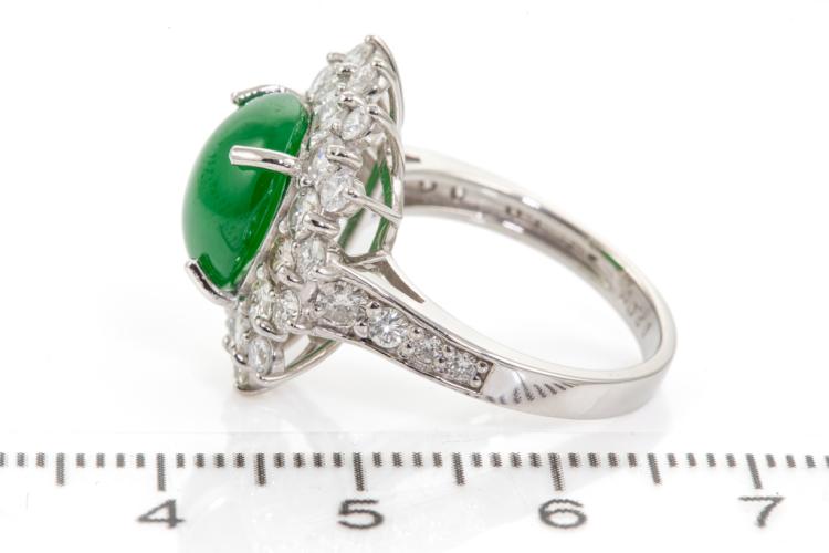 Jade and Diamond ring with an oval cabochon cut Natural Jadeite Jade - Type A of 4.80cts and round Natural Diamonds totalling 2.00cts (Estimated grading: H-I SI-P1). Platinum 950. Ring size M. Band width: 3.97mm -2.70mm. Weight: 9.2g. With certificate #417574. (Pre-owned)