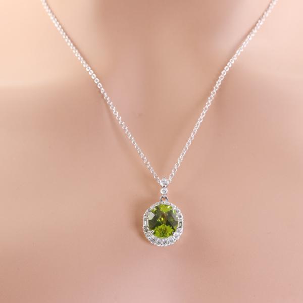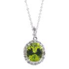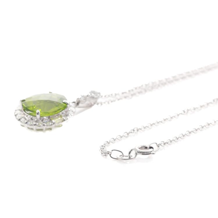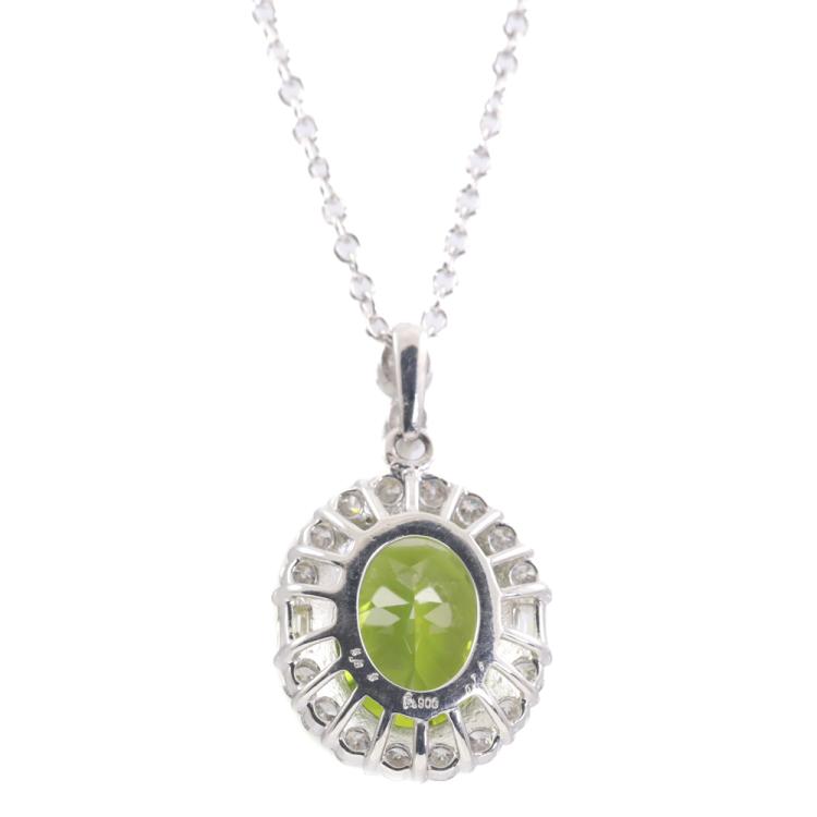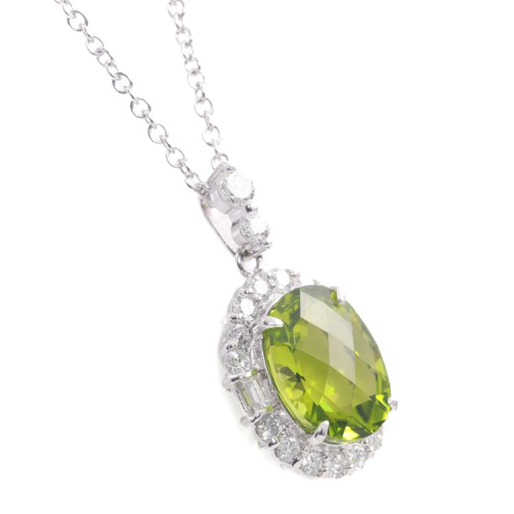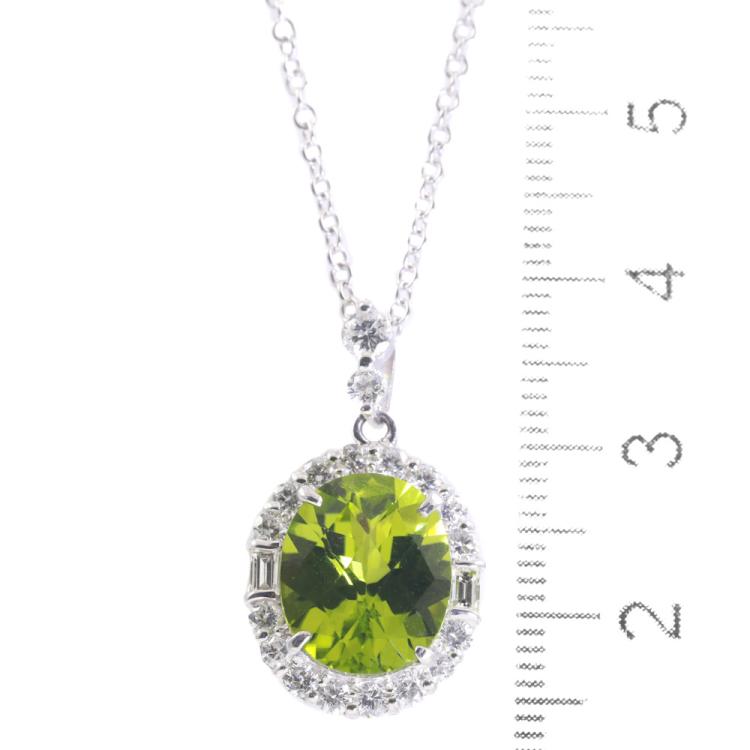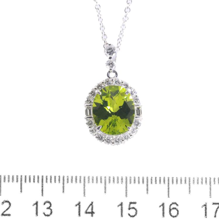 Peridot and Diamond pendant with oval shape Natural Peridot 4.84ct and round & baguette cut Natural Diamonds totalling 0.76ct (Estimated Grading: G-H & J-K VS-SI). Platinum - 900 with 18ct white gold 45cm chain. Weight: 6.9g. (Pre-owned)