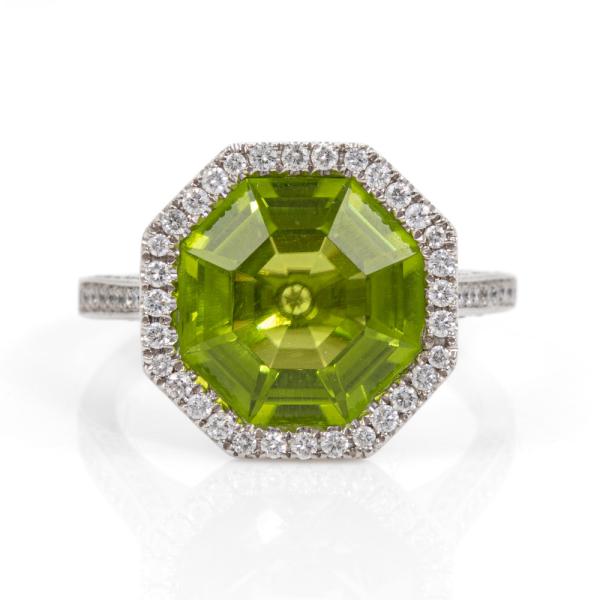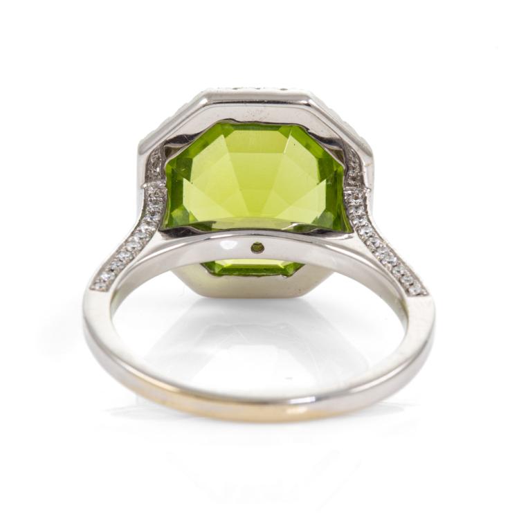 Peridot and Diamond ring with fancy octagonal cut natural Peridot of 5.04ct and round natural Diamonds totalling 0.45cts (Estimated grading: H SI). 18ct white gold. Ring size L1/2 - ring resizing is not recommended. Band width: 1.6mm - 2.0mm. Weight: 4.9g. (Pre-owned)