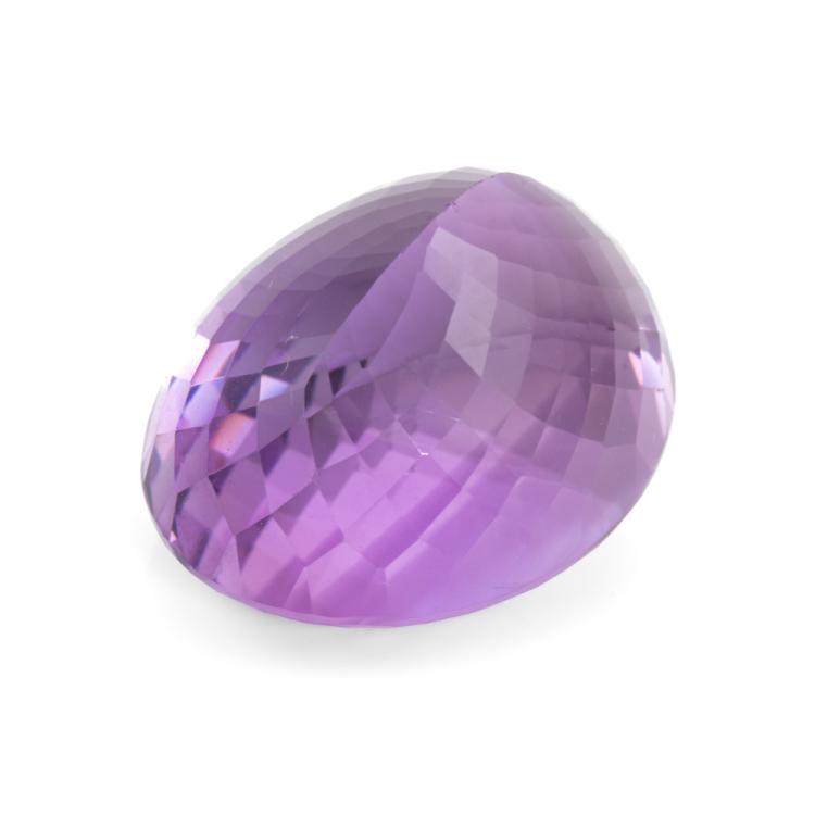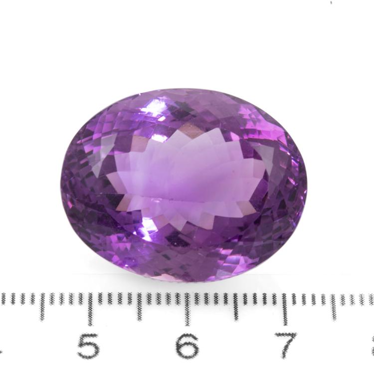 Loose oval cut Amethyst of 52.40ct. Approximate dimensions: 25.5 x 20.3 x 15.9mm. Note: Minor wear on pavilion. (New)