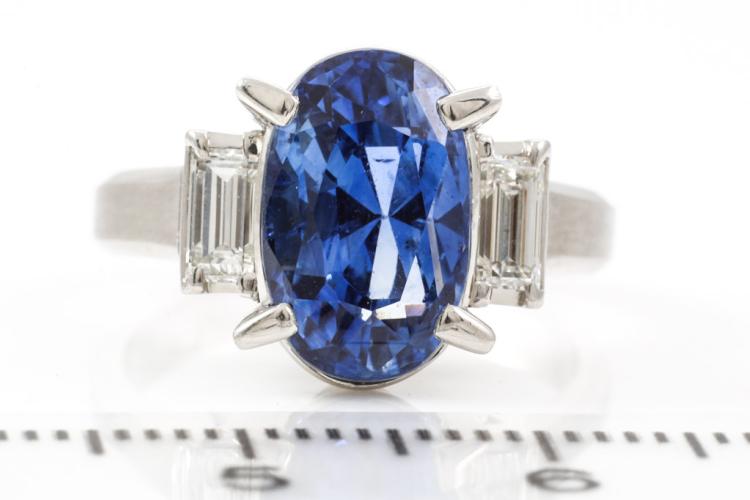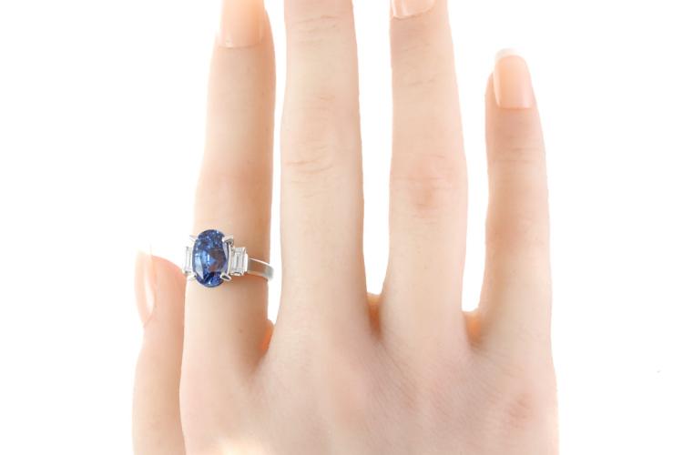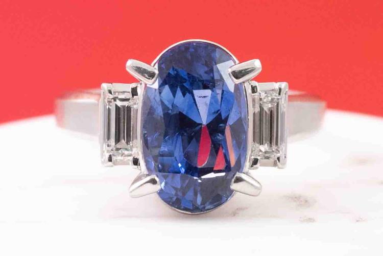 Sapphire and Diamond ring with oval shape blue Natural Sapphire of 5.37ct and baguette cut Natural Diamonds totalling 0.47cts (Estimated grading: G VS). Platinum - 900. Ring size J1/2. Weight: 8.5g. With certification #417224. (Pre-owned)