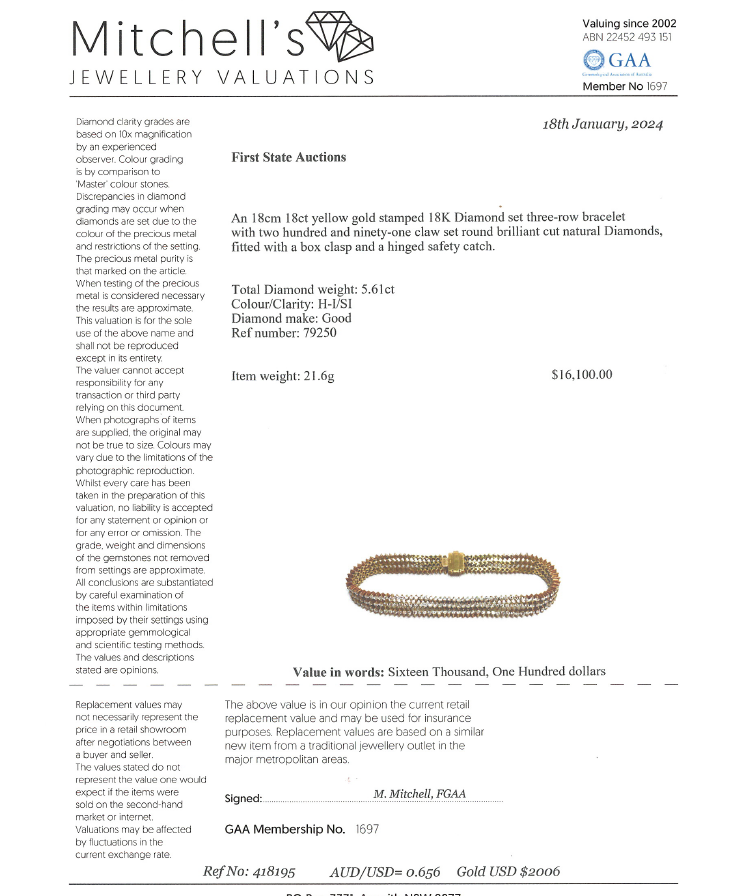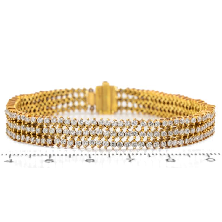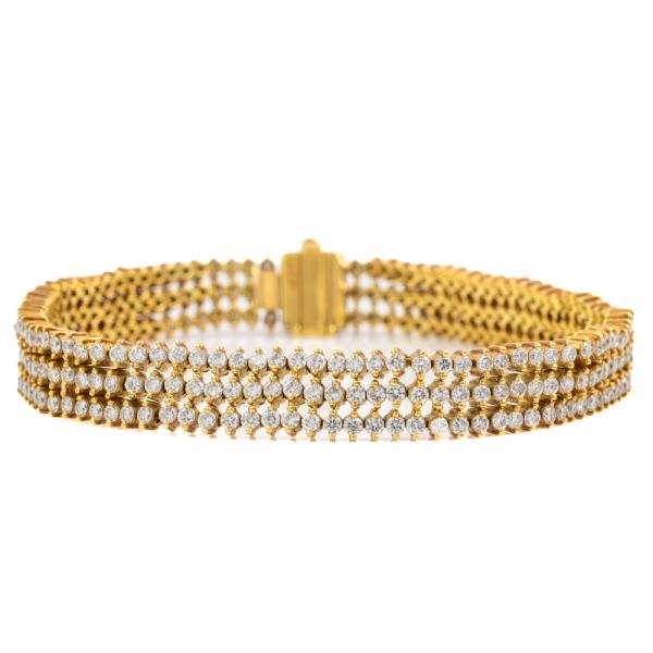 Diamond three-row bracelet with round Natural Diamonds totalling 5.61cts (Estimated grading: H-I SI). 18ct yellow gold. Length: 18.0cm. Weight: 21.6g. With Valuation Certificate #418195. (Pre-owned)