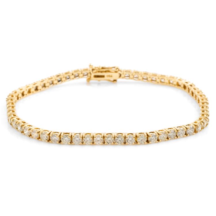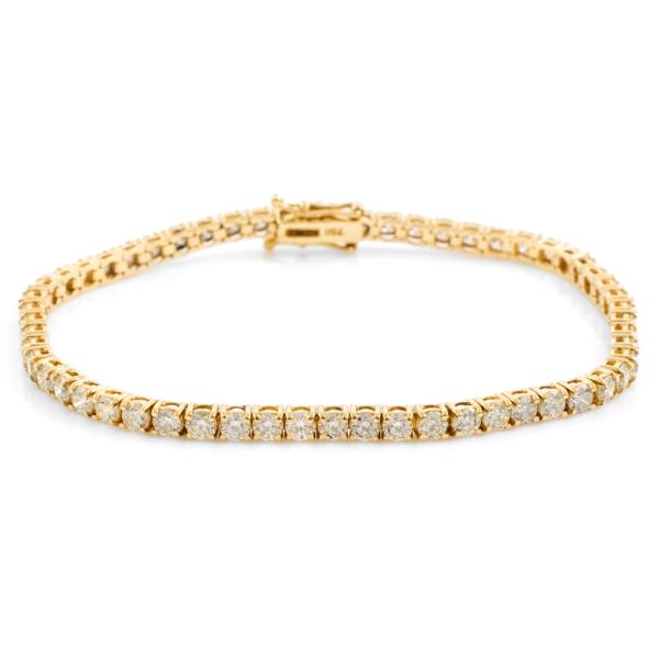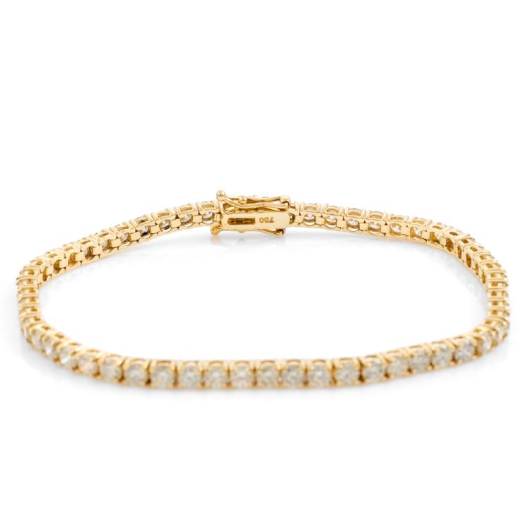 Diamond tennis bracelet with 57 round brilliant cut Natural Diamonds totalling 5.95ct. (Estimated grading: I-J SI). 18ct yellow gold. Length: 18cm. Weight: 10.4g. With Valuation Certificate #417979. (New)