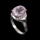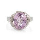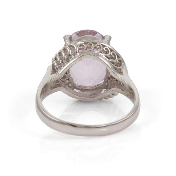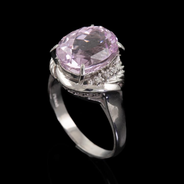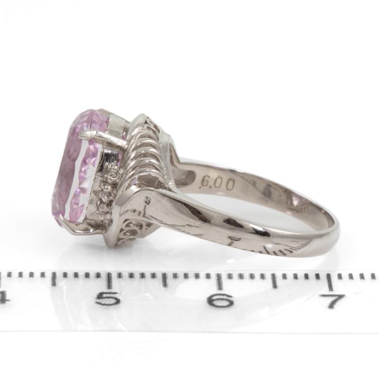 Kunzite and Diamond ring with oval shape checkerboard cut Natural Kunzite of 6.00ct and round Natural Diamond totalling 0.06ct. Platinum 900. Ring size L. Band width: 2.40mm - 3.50mm. Weight: 6.9g. (Pre-owned)
