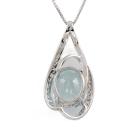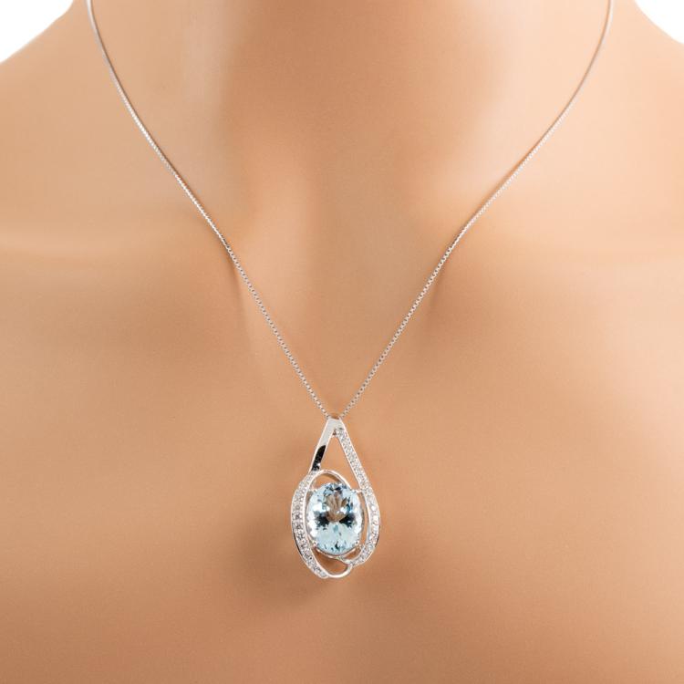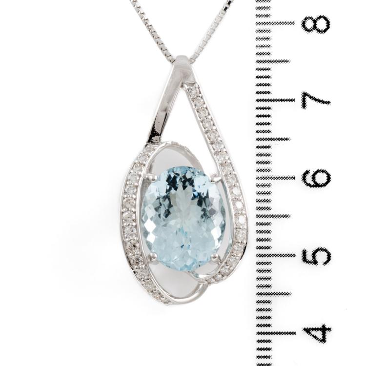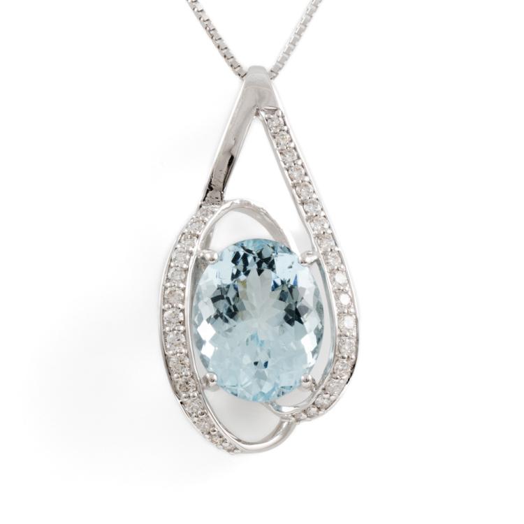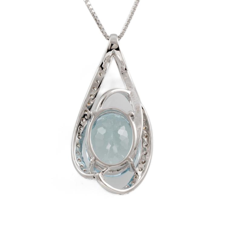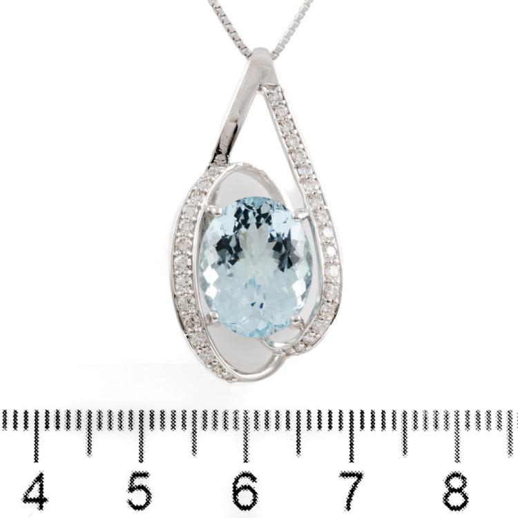 Aquamarine and Diamond pendant with oval shape natural Aquamarine of 6.04ct and natural Diamonds totalling 0.47cts (Estimated grading: H SI). 18ct white gold with 18ct white gold adjustable chain. Length: max 45.0cm. Weight: 7.4g. (Pre-owned)