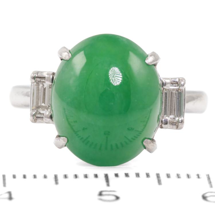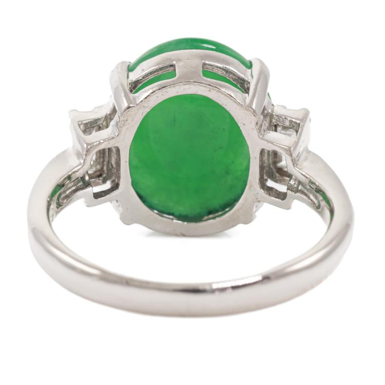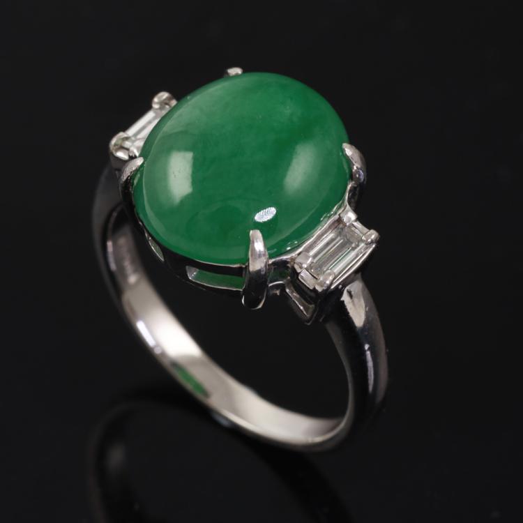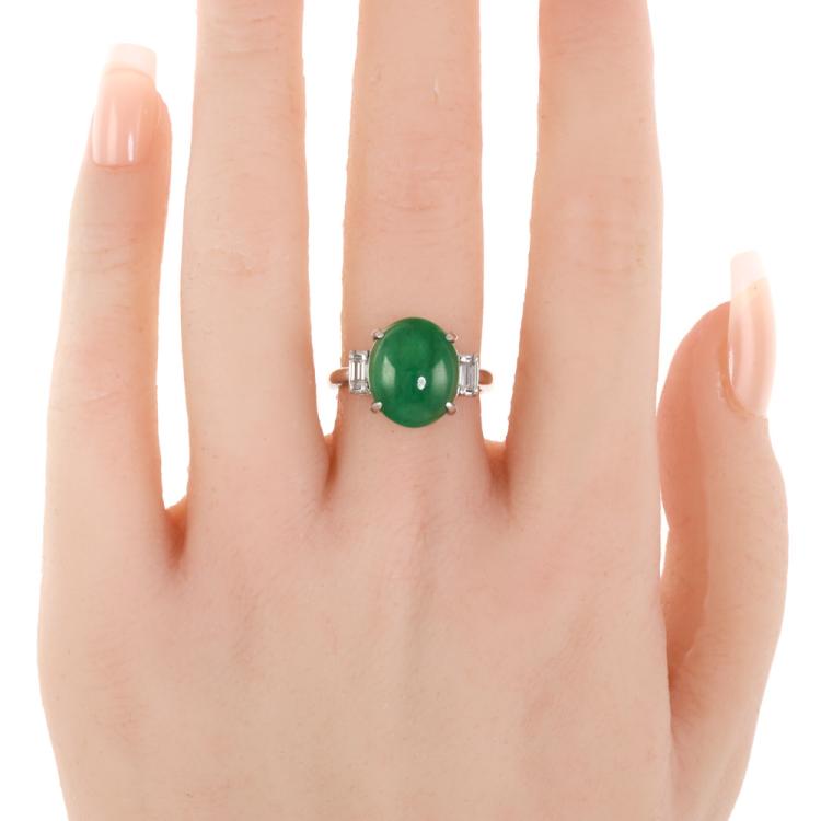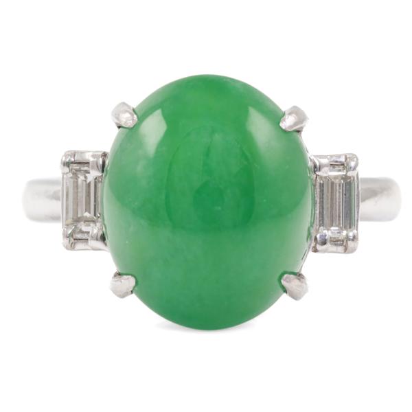 Jade and Diamond ring with oval Cabochon cut Natural Jadeite Jade - Type A of 6.95ct and 2 baguette cut Natural Diamonds totalling 0.29ct. Platinum - 900. Ring size: L1/2. Band width: 2.3mm. Weight: 6.6g. (Pre-owned)