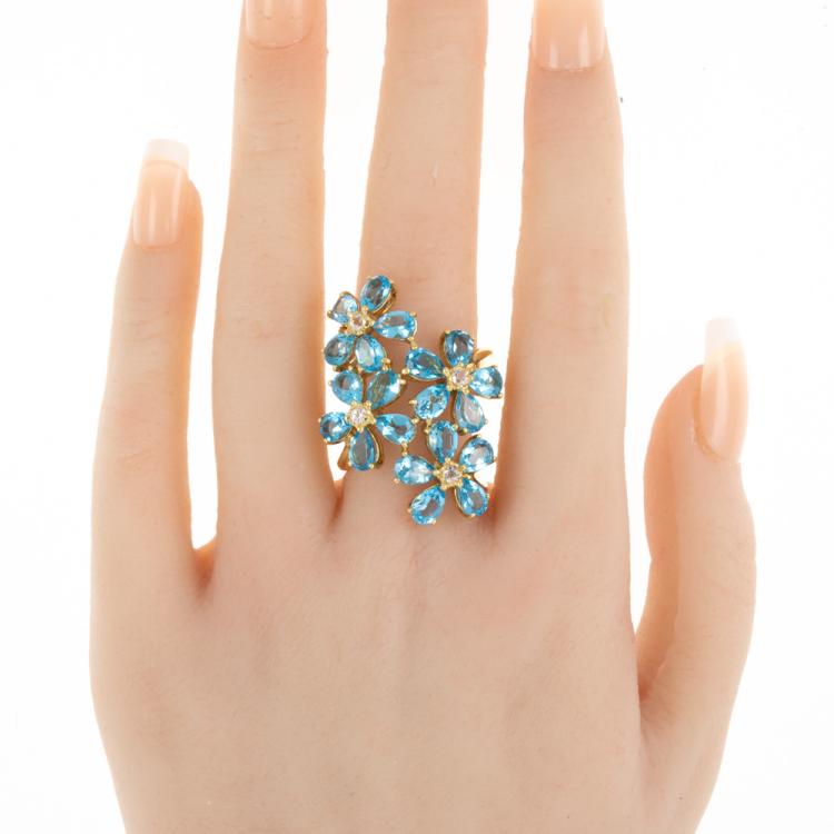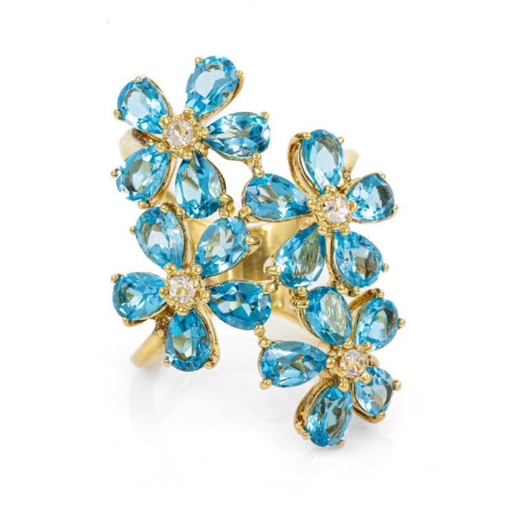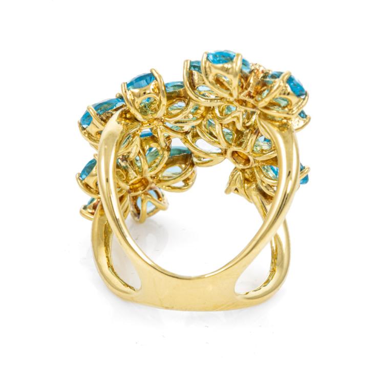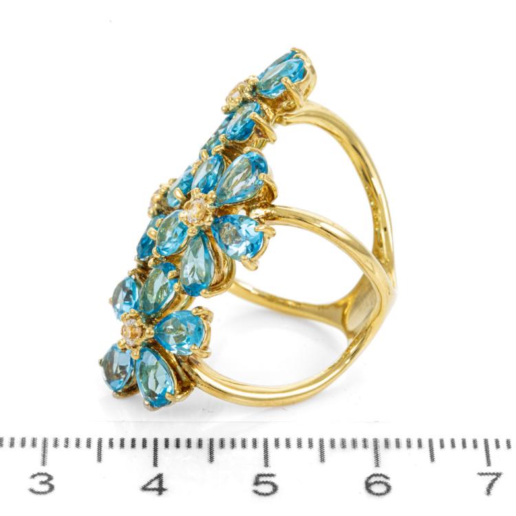 Topaz ring with pear shape natural blue Topaz (5.4 x 4.0mm) totalling approx. 7.20ct and round natural light pink Topaz totalling approx. 0.16ct. 18ct yellow gold. Ring size L - ring resizing is not recommended. Length of design on finger: 40.0mm. Weight: 14.9g. (Pre-owned)
