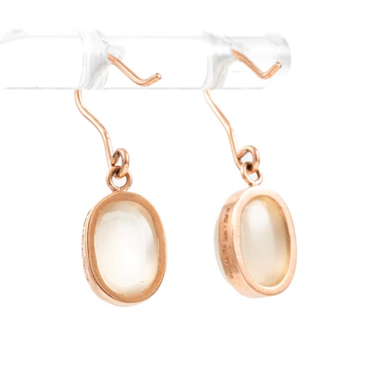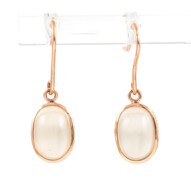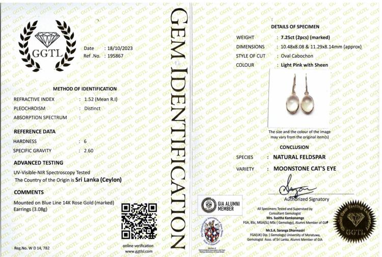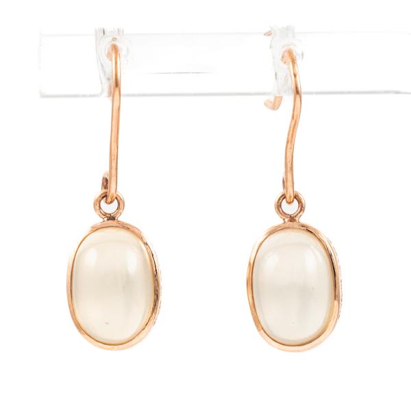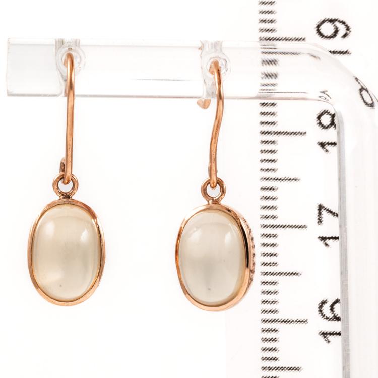 Moonstone shepherds hook earrings with oval cabochon cut Ceylon Natural Moonstone totalling 7.25cts. 14ct rose gold. Weight: 3.0g. With GGTL report #195867. (As new)