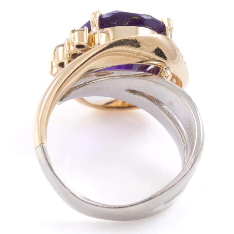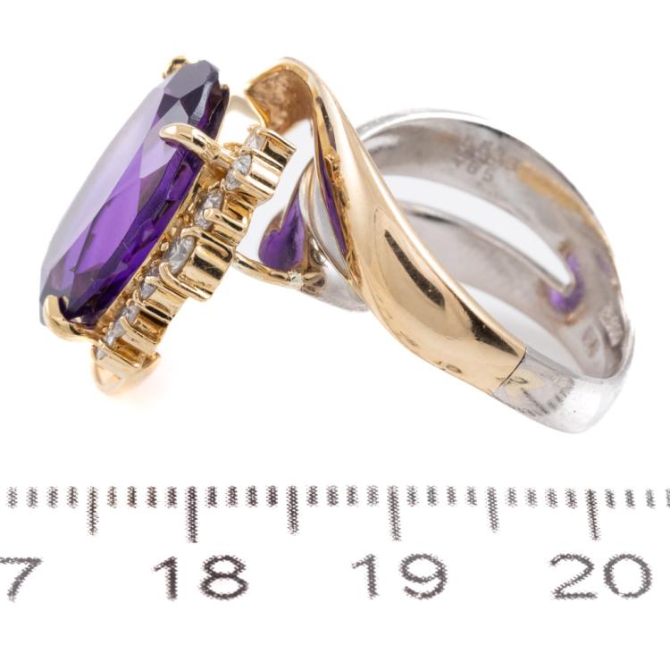 Amethyst & Diamond ring with oval Natural Amethyst of 7.65ct and round Natural Diamonds totalling 0.33ct (Estimated grading: H-I SI). Platinum 900 and 18ct yellow gold. Ring size L. Minimum band width: 3.5mm. Weight: 12.6g. (Pre-owned)