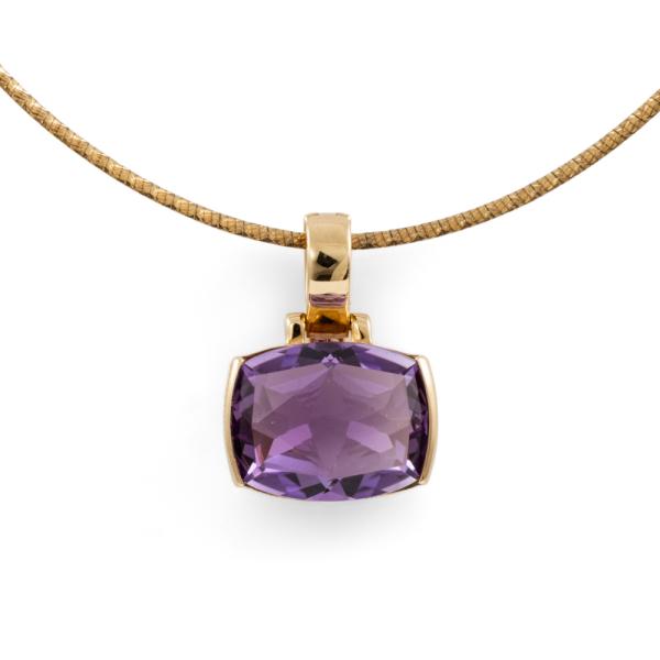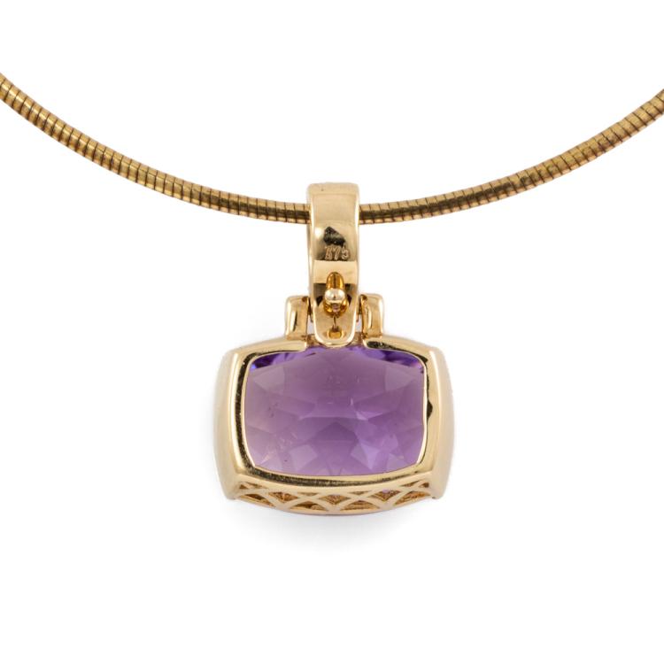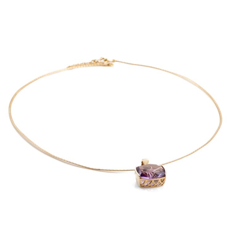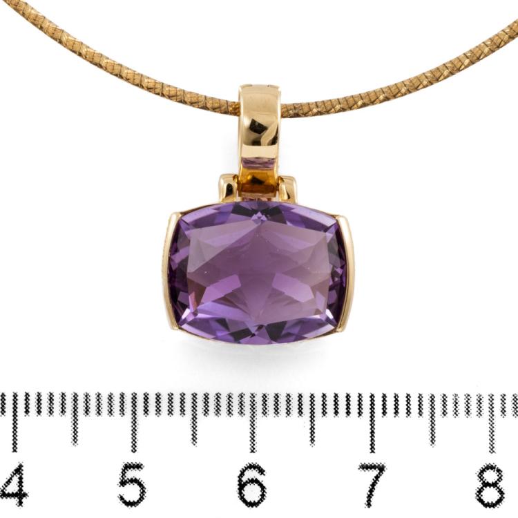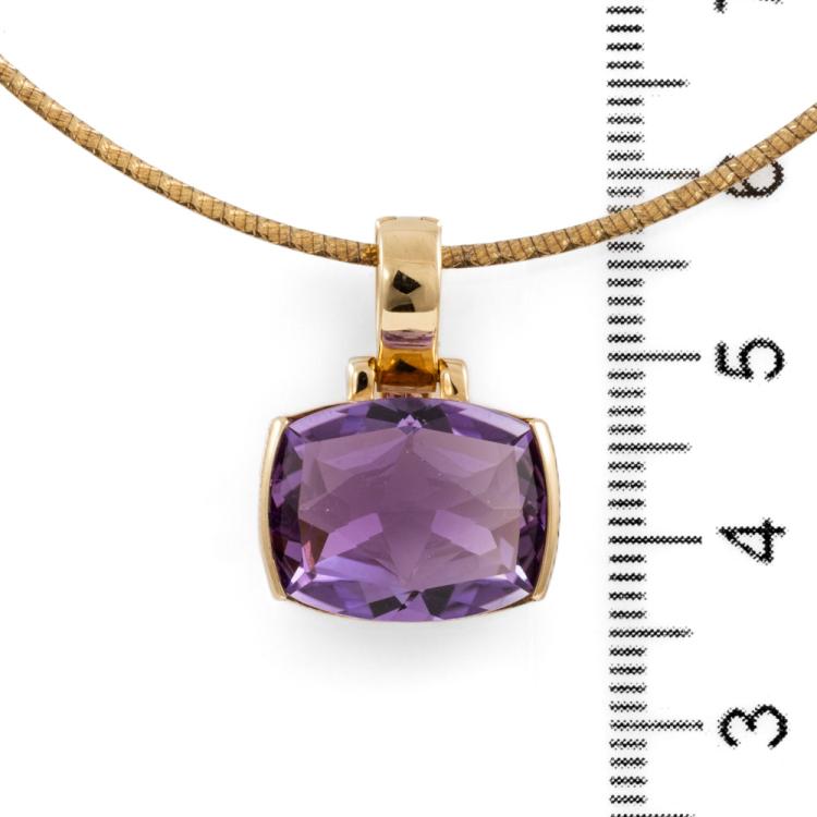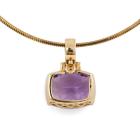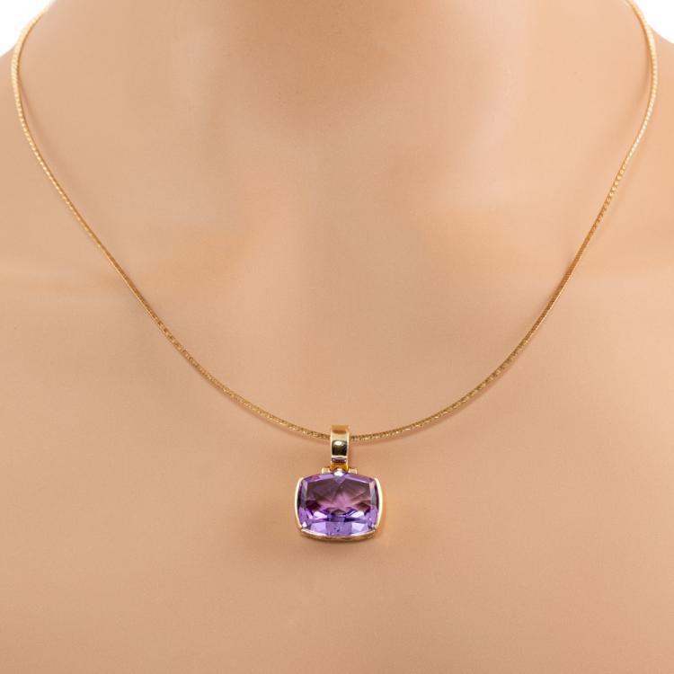 Amethyst pendant with a cushion cut Natural Amethyst of approximately 8.00cts. 9ct yellow gold with adjustable 50cm chain. Weight: 9.1g. (Pre-owned)