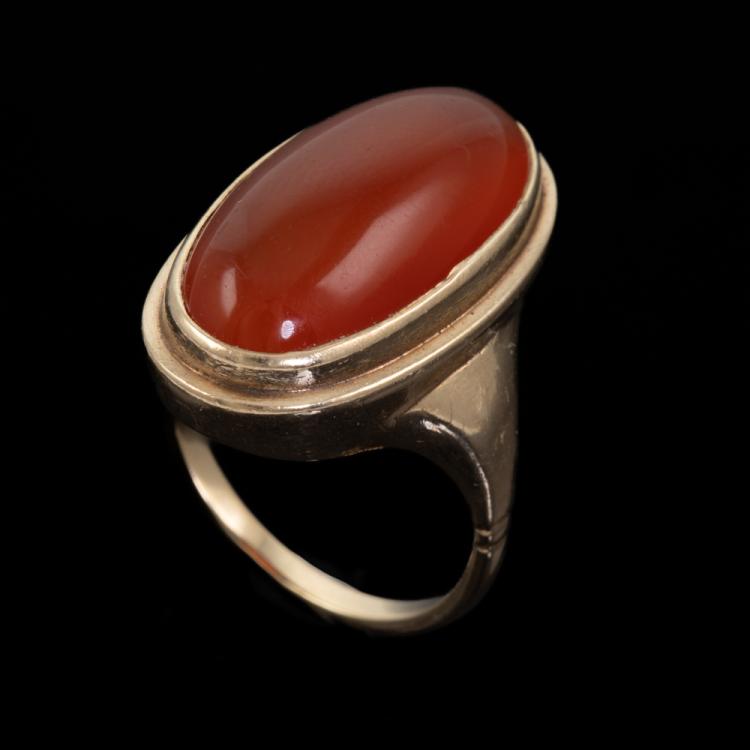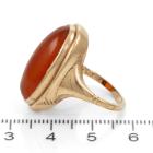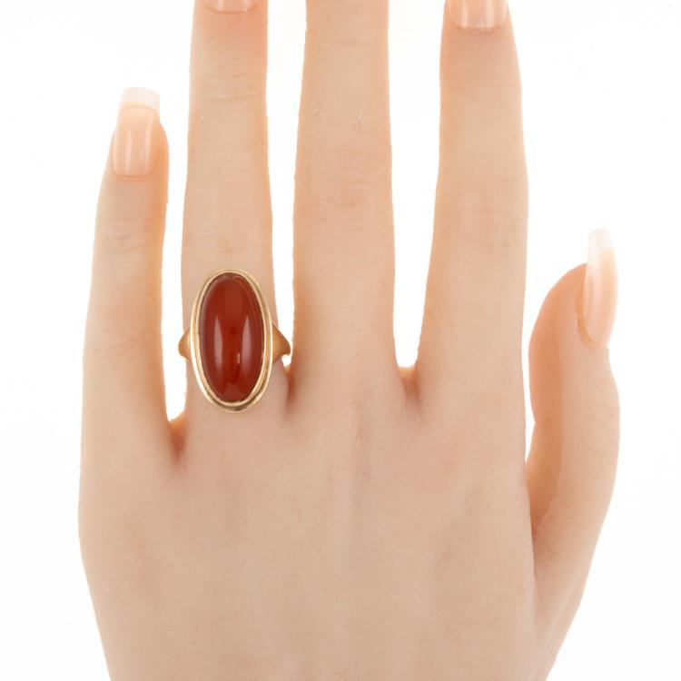 Carnelian ring with oval cabochon cut Natural Carnelian of approximately 8.20ct. 9ct yellow gold. Ring size K1/2. Band width: 1.8mm - 2.6mm. Weight: 6.8g. (Pre-owned)