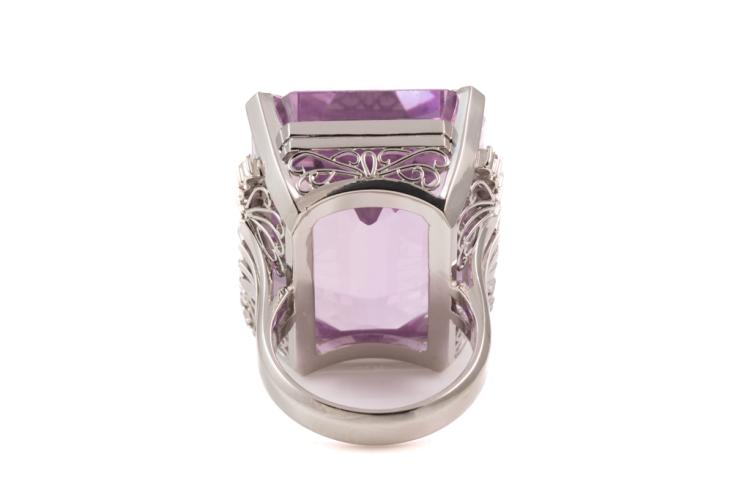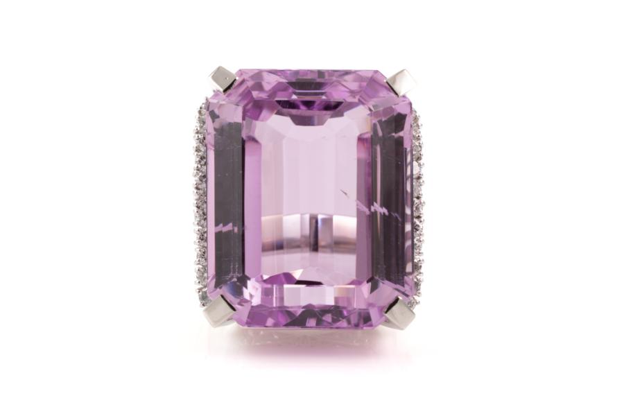 Kunzite and Diamond ring with an emerald cut Natural Kunzite of 85.94ct and round Natural Diamonds totalling 0.78ct (Estimated grading: H-I SI). Platinum 900. Ring size P. Weight: 39.7g. With Certificate #417503. (Pre-owned)