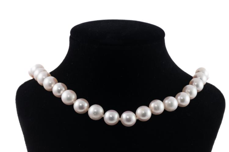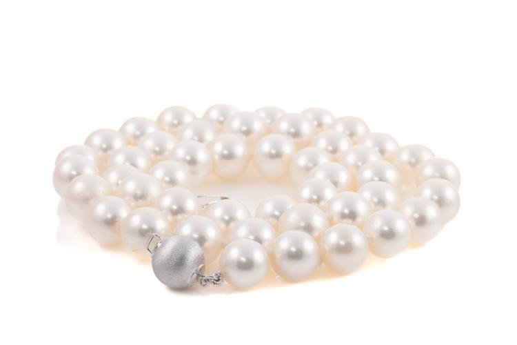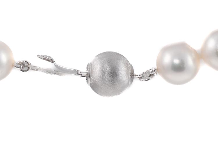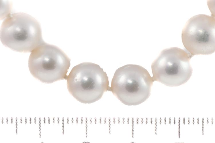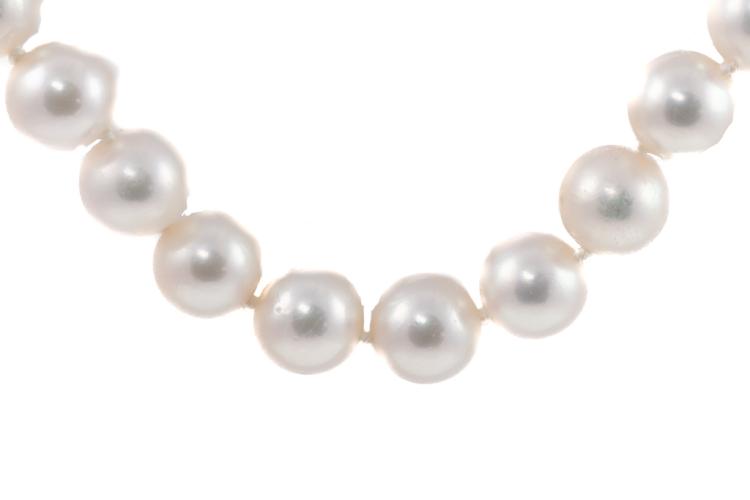 Pearl necklace with 46 Akoya Pearls of 8.5mm - 8.9mm. 14ct white gold ball clasp. Length: 45cm. Weight: 44.2g. (Pre-owned)
