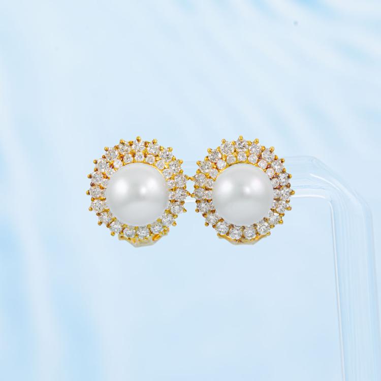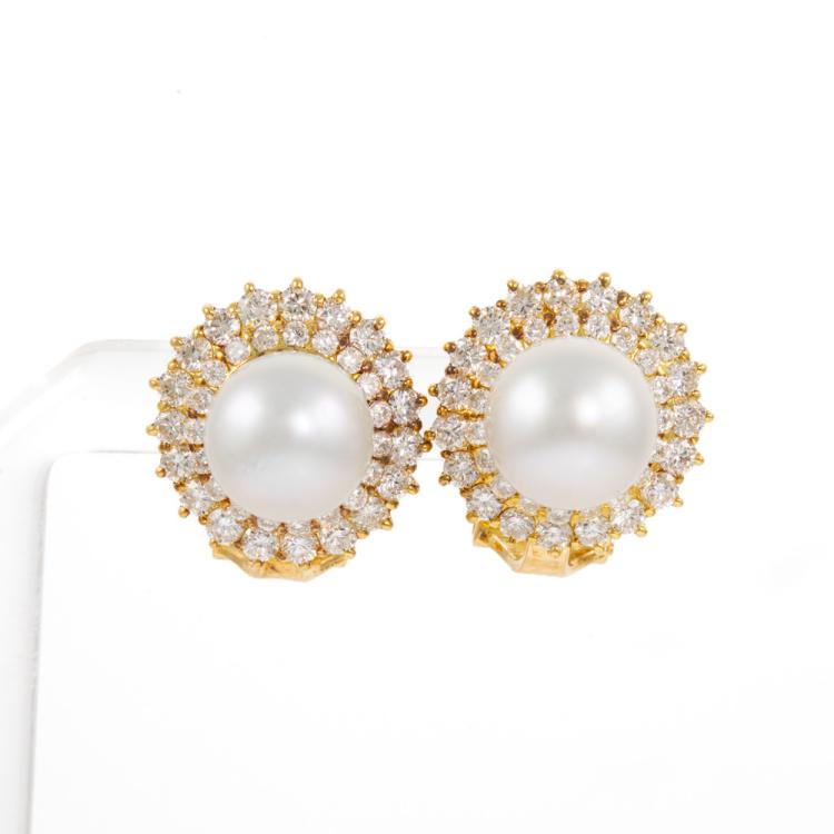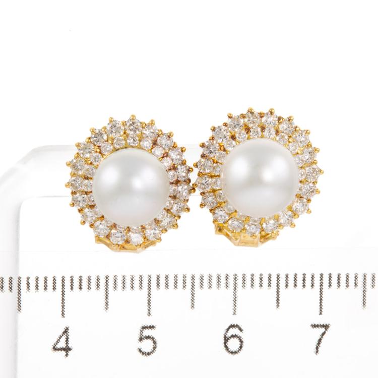 Pearl and Diamond clip-on earrings (for pierced ears) with South Sea Pearl of 8.8mm - 9.0mm and round Natural Diamonds totalling 1.72cts (Estimated grading: G-H VS-SI). 18ct yellow gold. Weight: 9.0g. (Pre-owned)
