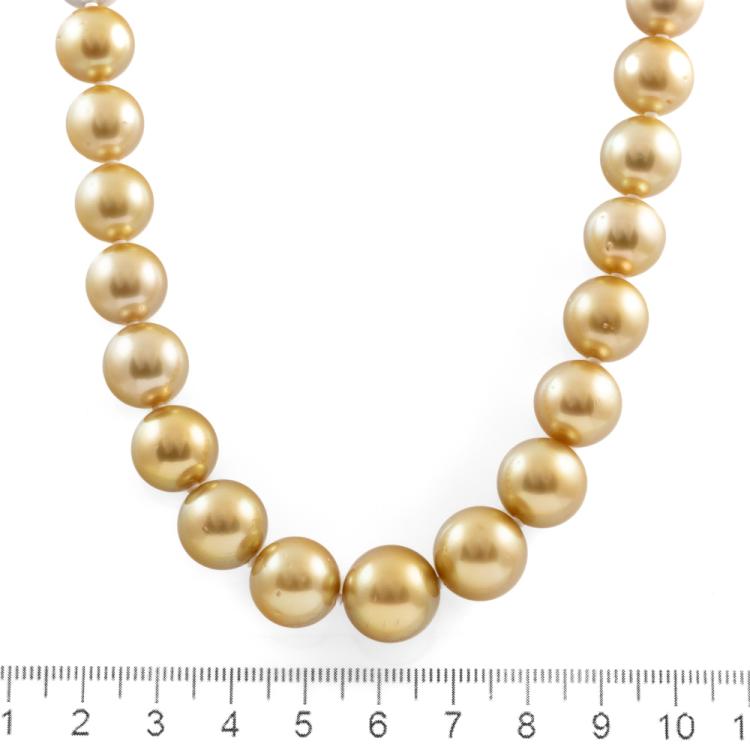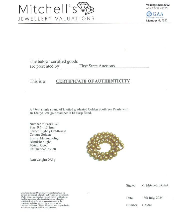 Pearl necklace with 39 graduated Golden South Sea Pearls of 9.1mm - 13.2mm. with 18ct yellow gold clasp. Length: 47cm. Weight: 79.1. With Certificate #418902. (Pre-owned)