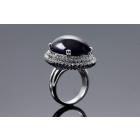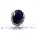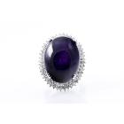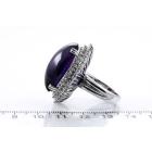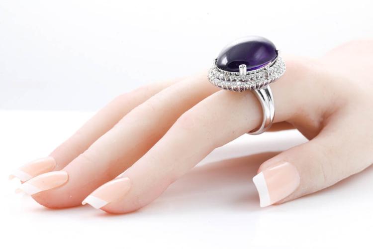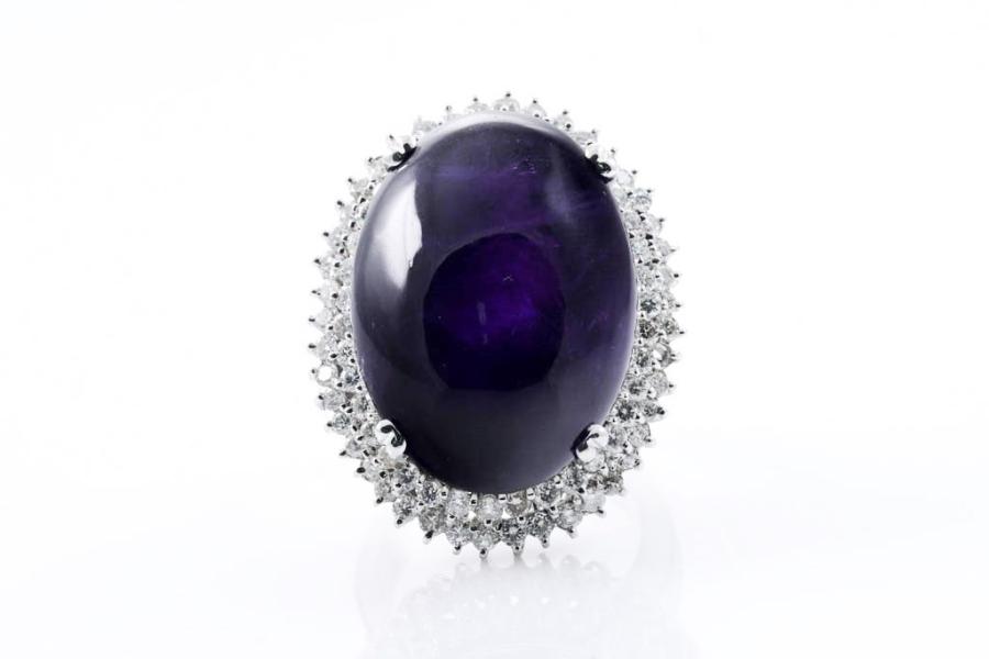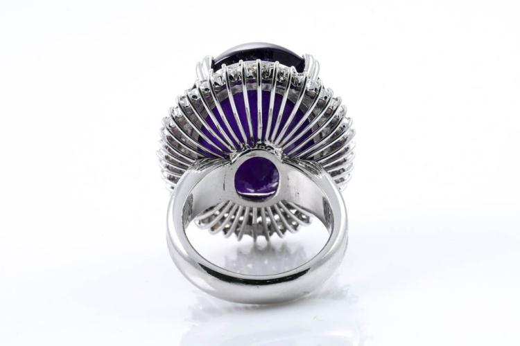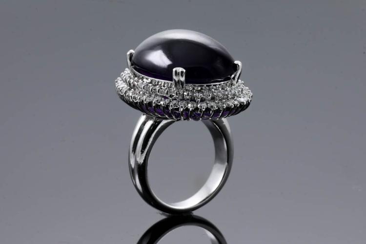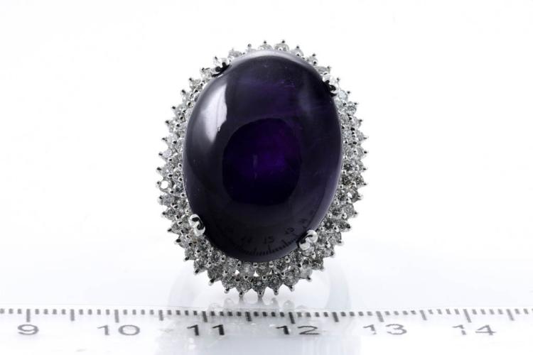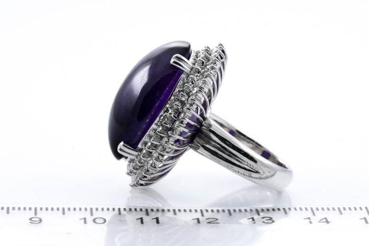 Amethyst and Diamond ring with oval cabochon Amethyst of 60.00ct and round natural Diamonds totalling 1.60cts (Estimated grading: I-J P1). 18ct white gold. Ring size P . Weight: 26.3g. With certificate #416389. (Pre-owned)