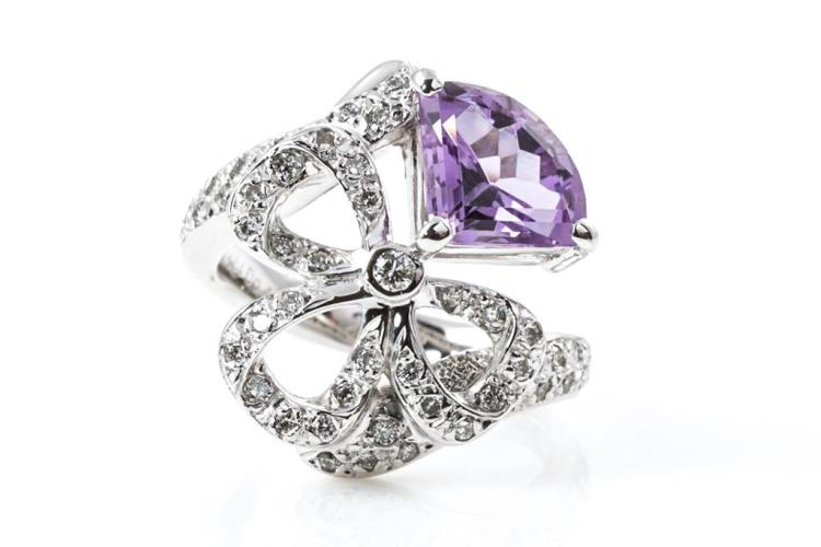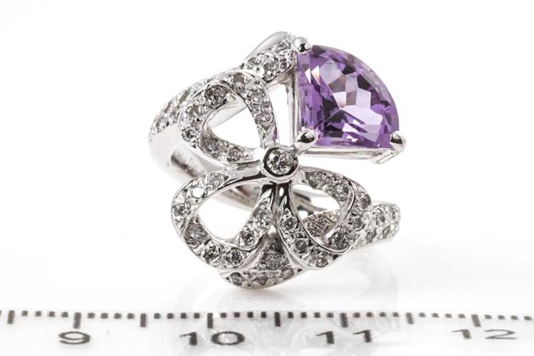 Amethyst and Diamond ring with a fancy cut Natural Amethyst of 1.84ct and Natural Diamonds totalling 0.48ct (Estimated grading: H SI). 18ct white gold. Ring size K1/2 - cannot be resized up, down with ring clip. Weight: 9.7g. (Pre-owned)^