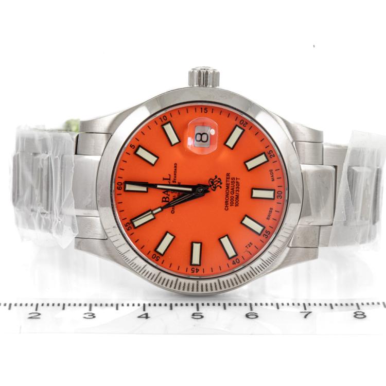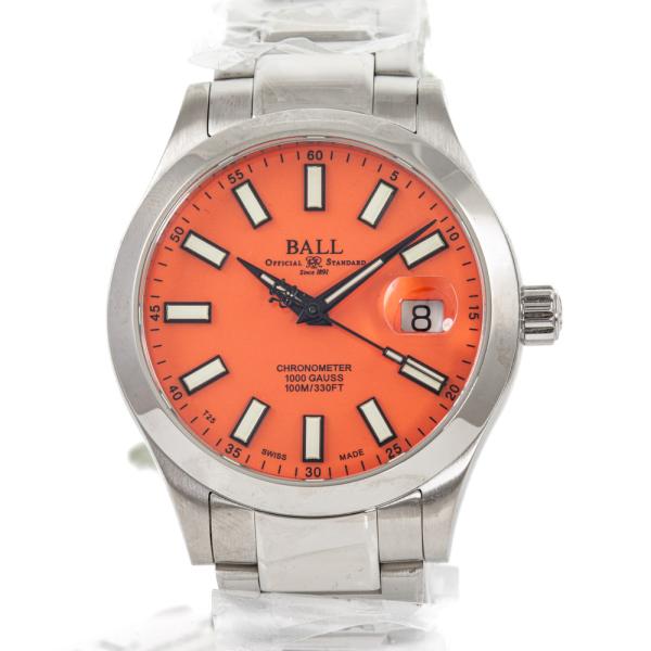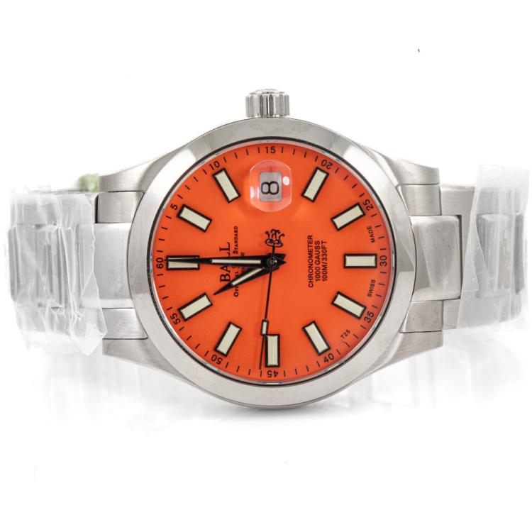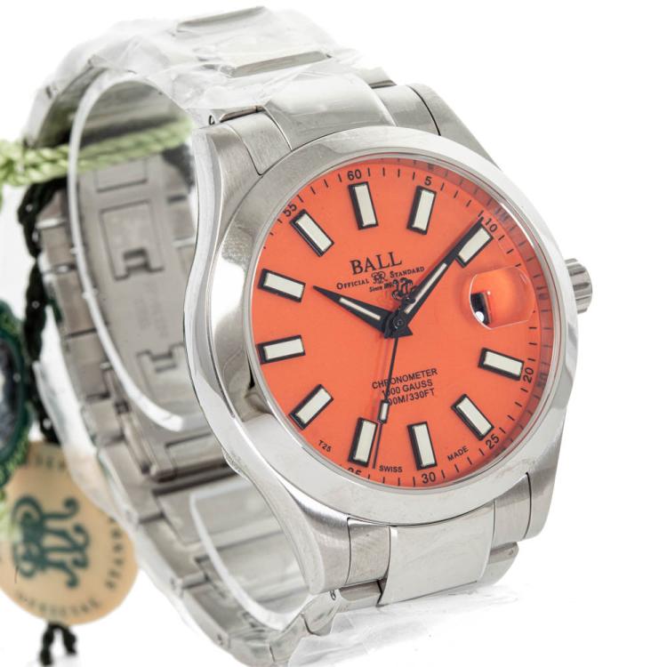 Ball Engineer III Marvelight stainless steel automatic mens watch. Orange dial, date, case diameter: 40mm, wrist size: 18.5cm, Swiss made. Ref# NM9026C-S39CJ-OR. With Ball stainless steel bracelet and clasp. With Premium International Warranty Certificate card, Ball Chronometer card and Ball box. 12 month FSA warranty (As new, Note: case and bracelet on original wrapping)