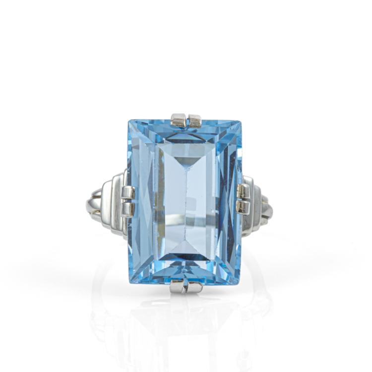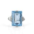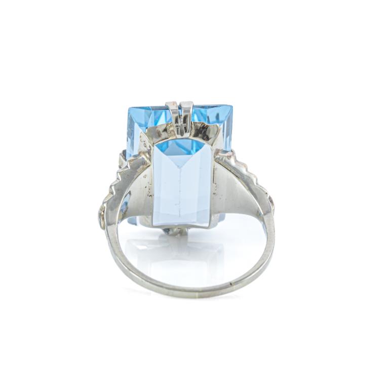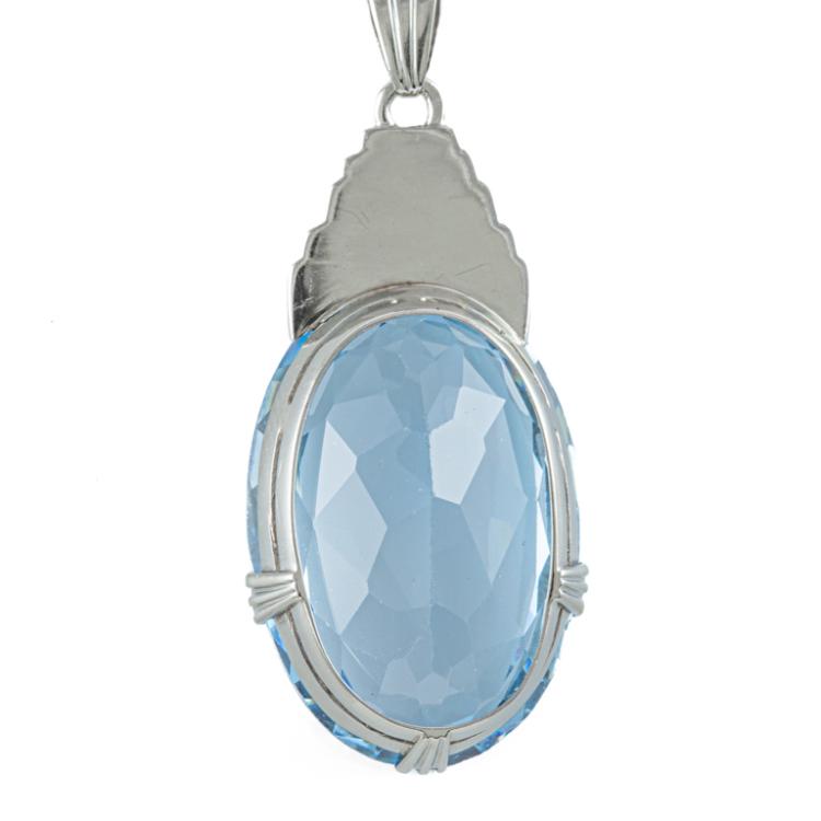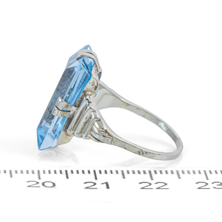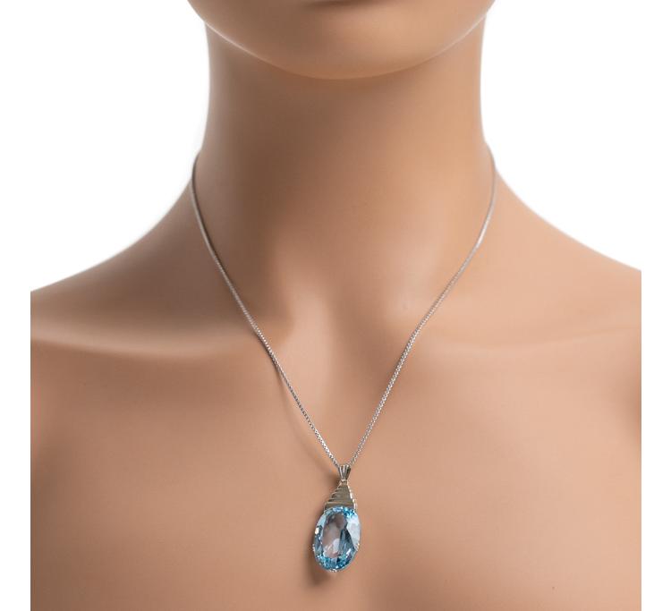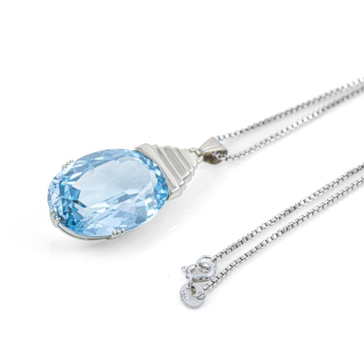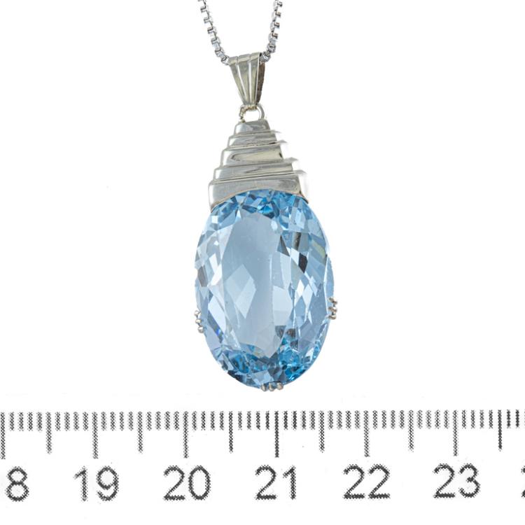 Topaz ring and pendant set. 1) Topaz ring with a step rectangular cut Natural blue Topaz of approximately 15.00ct. 14ct white gold (XRF tested, not stamped). Ring size: O. Band width: 1.2mm - 1.7mm. 2) Topaz pendant with oval shape Natural blue Topaz of approximately 17.00ct. 14ct white gold (XRF tested, not stamped) with 46cm 14ct white gold chain. Total weight: 15.2g. (Pre-owned)
