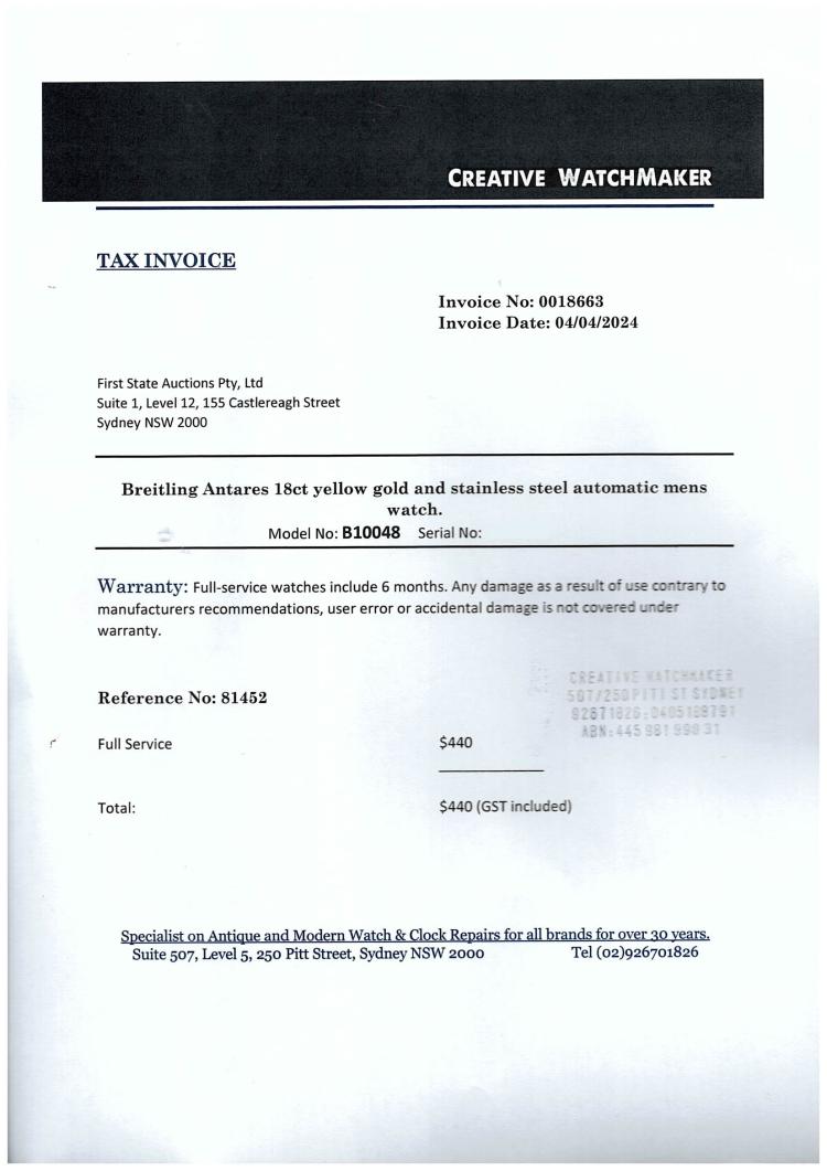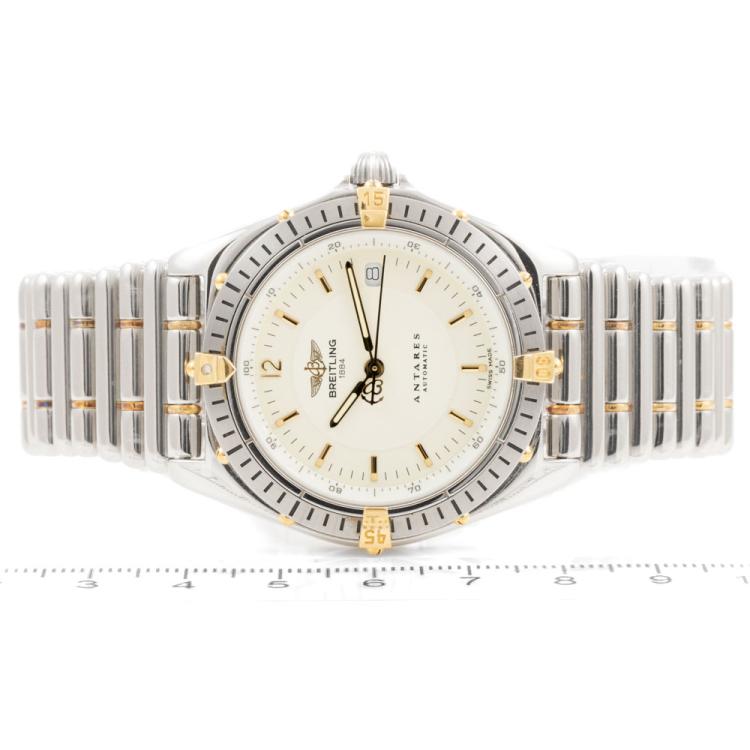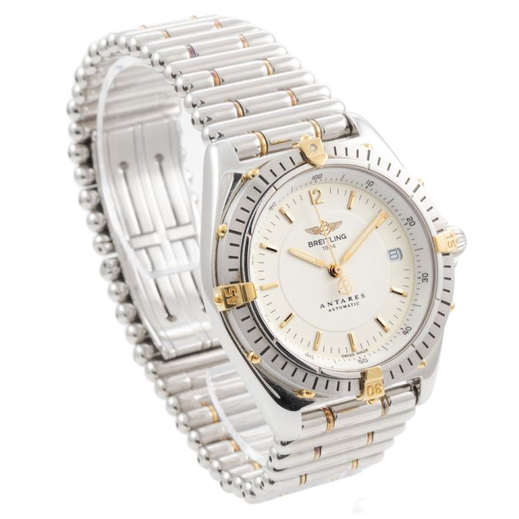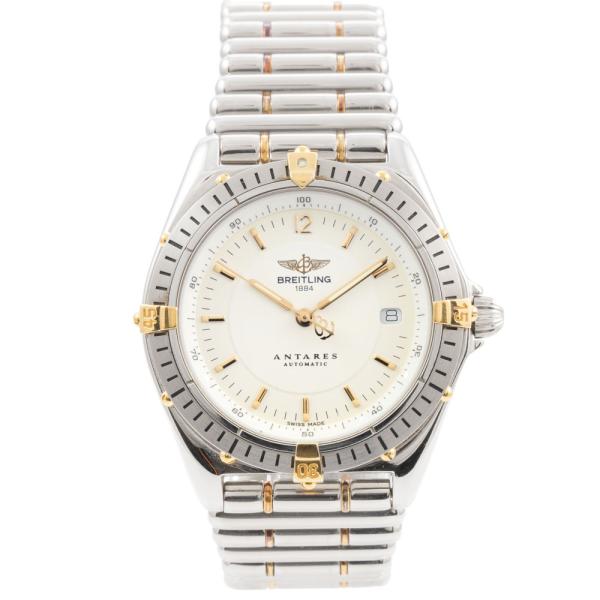 Breitling Antares 18ct yellow gold and stainless steel automatic mens watch. Cream dial, date, case diameter: 39mm, wrist size: 19cm, Swiss made. Ref# B10048. With Breitling two-tone bracelet and clasp. With Certificate of Authenticity, Creative watchmaker full service invoice dated 04/04/2024 and Breitling box. 6 month Creative Watchmaker warranty from the date of full service. (Pre-owned)