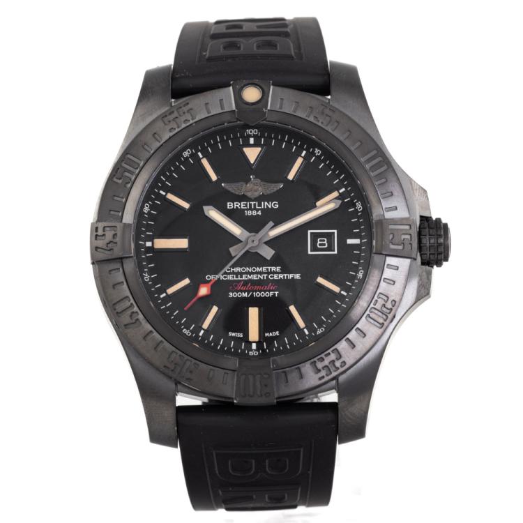 Breitling Avenger Blackbird special edition titanium automatic mens watch. Black dial, date, case diameter: 48mm, strap length: 24cm, Swiss made. Ref# V1731010.BD12. With Breitling black rubber strap and buckle. With Certificate of Authenticity, Breitling International E-warranty card dated 27/07/2014 and Breitling box. 3 month FSA warranty (Pre-owned)