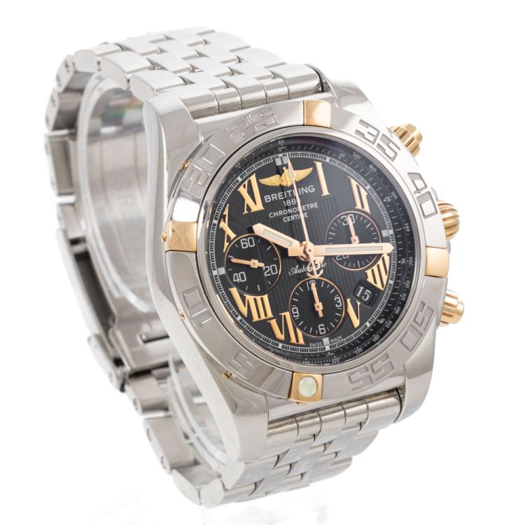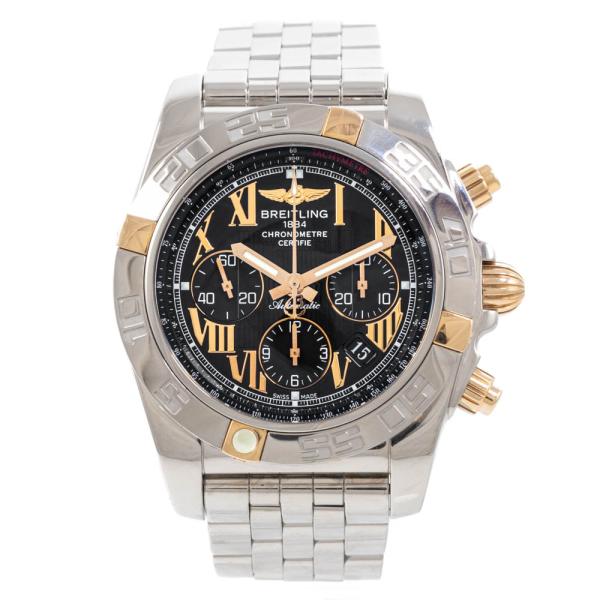 Breitling Chronomat 18ct rose gold and stainless steel automatic mens watch. Black chronograph dial, date, case diameter: 44mm, wrist size: 20cm, Swiss made. Ref# IB0110. With Breitling stainless steel bracelet and clasp. With Certificate of Authenticity, Breitling International Warranty booklet dated 21/03/2011 and Breitling box. 3 month FSA warranty (Pre-owned)
