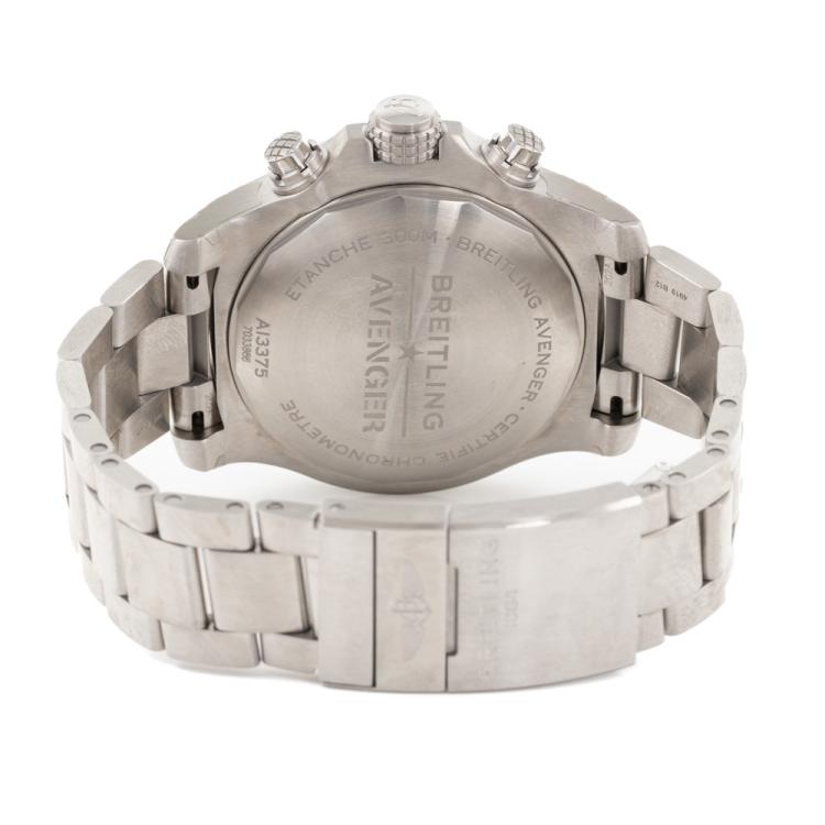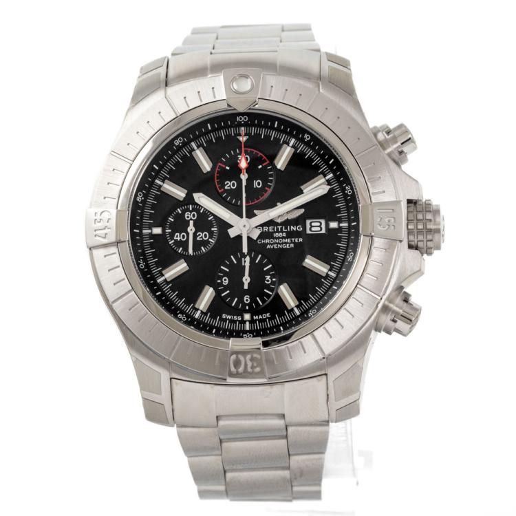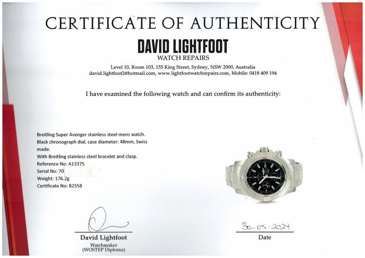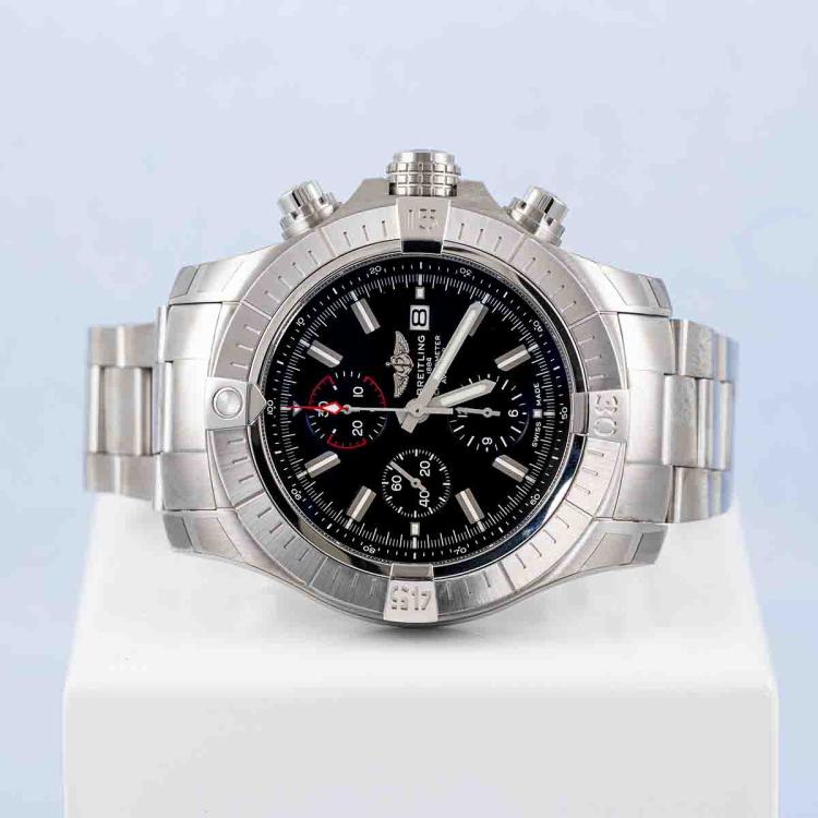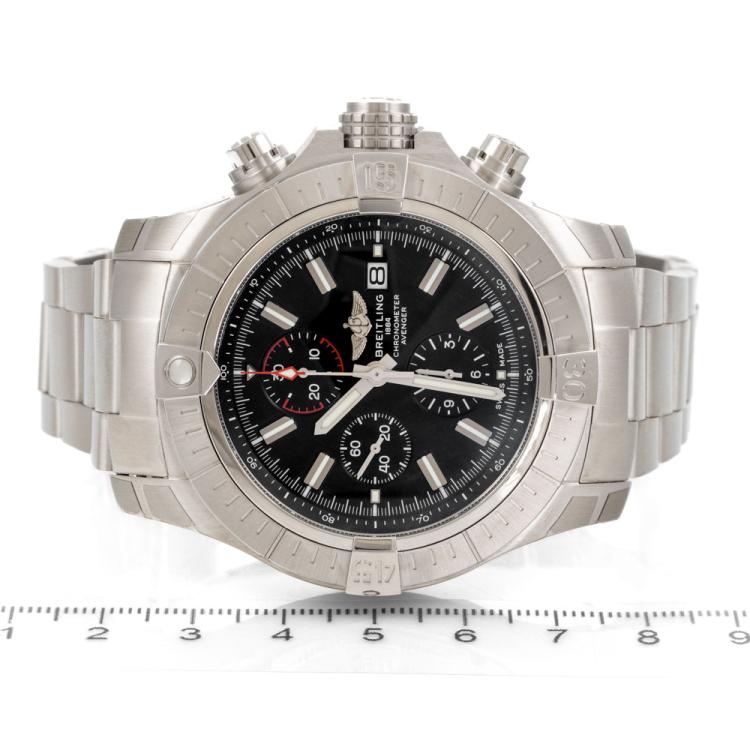 Breitling Super Avenger stainless steel mens watch. Black chronograph dial, case diameter: 48mm, wrist size: 21.5cm, Swiss made. Ref# A13375. With Breitling stainless steel bracelet and clasp. With Certificate of Authenticity, Undated Breitling International Warranty card and Breitling box. 3 month FSA warranty. (Pre-owned)
