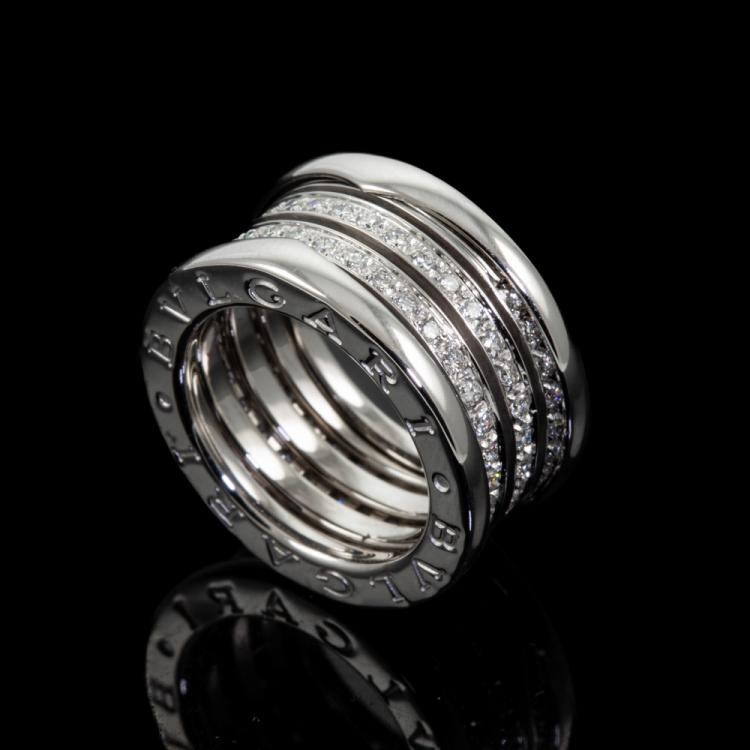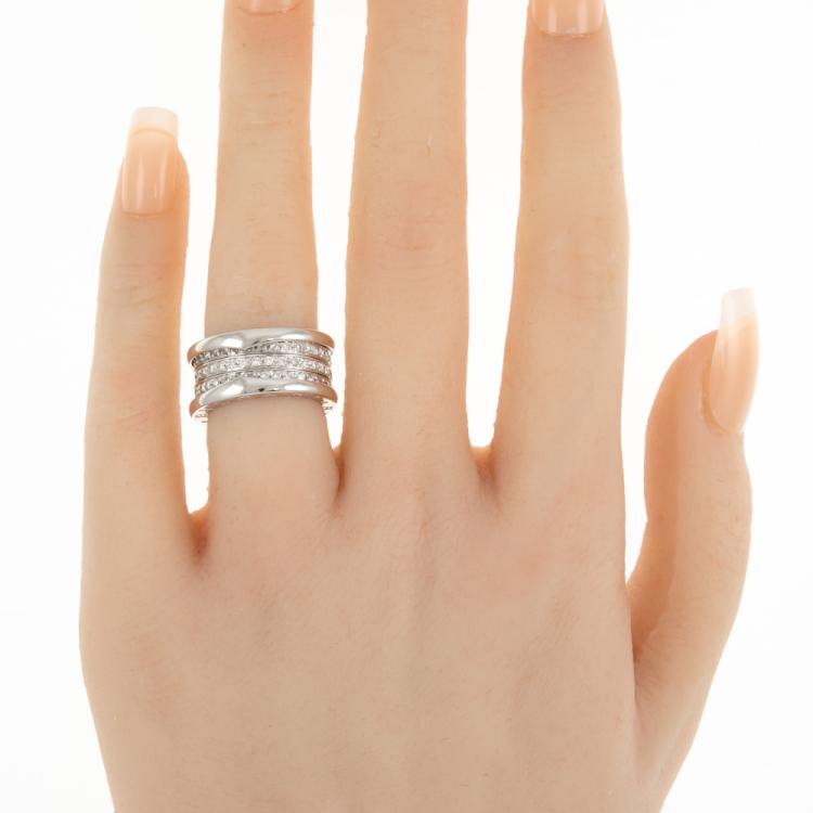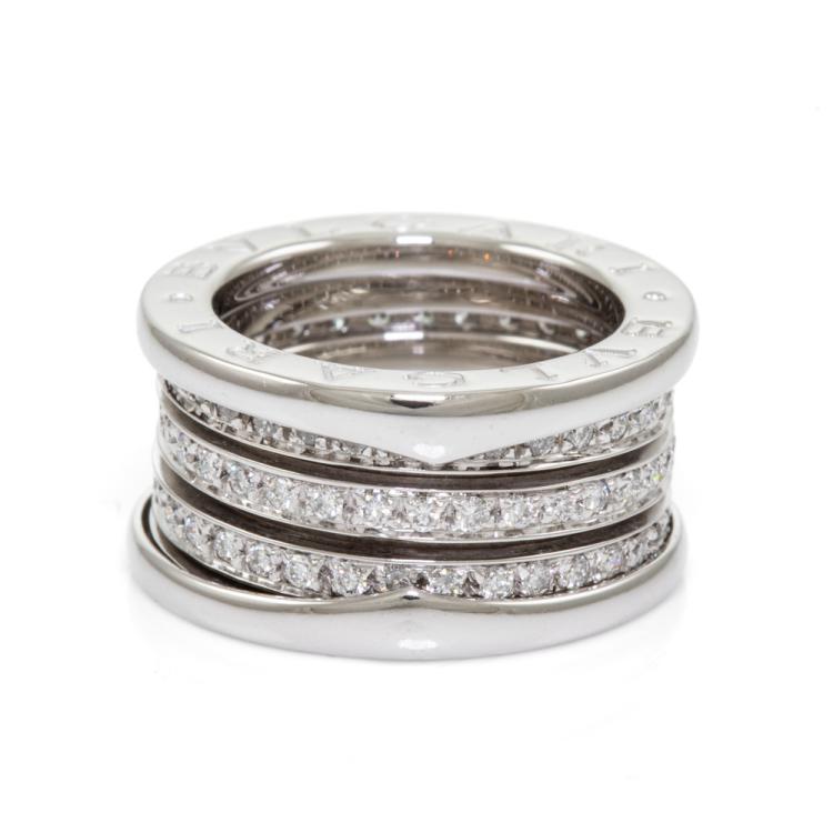 Bvlgari B.Zero1 full hoop Diamond four-band ring with round Natural Diamonds totalling 0.89cts (Estimated grading: F VS). 18ct white gold. Bvlgari stamped size 47, H - ring resizing is not recommended. Made in Italy. Width: 11mm. Weight: 11.2g. With Certificate #418575. (Pre-owned)