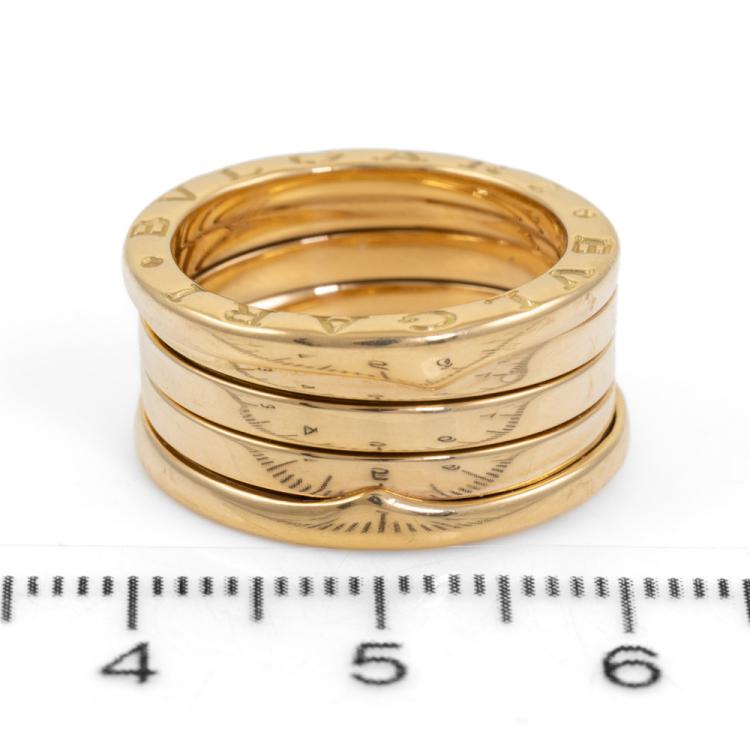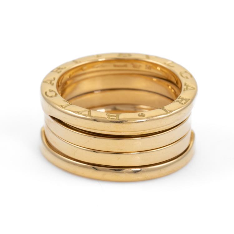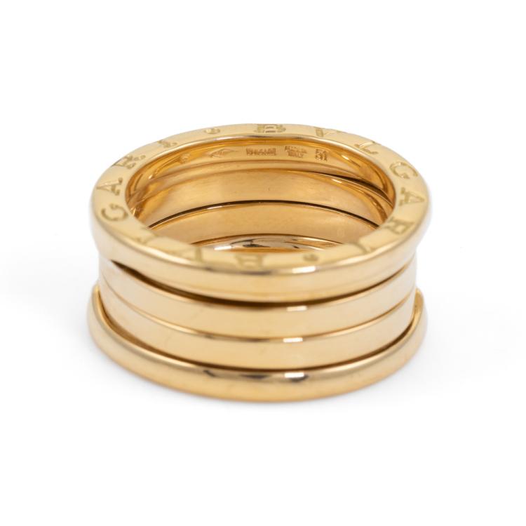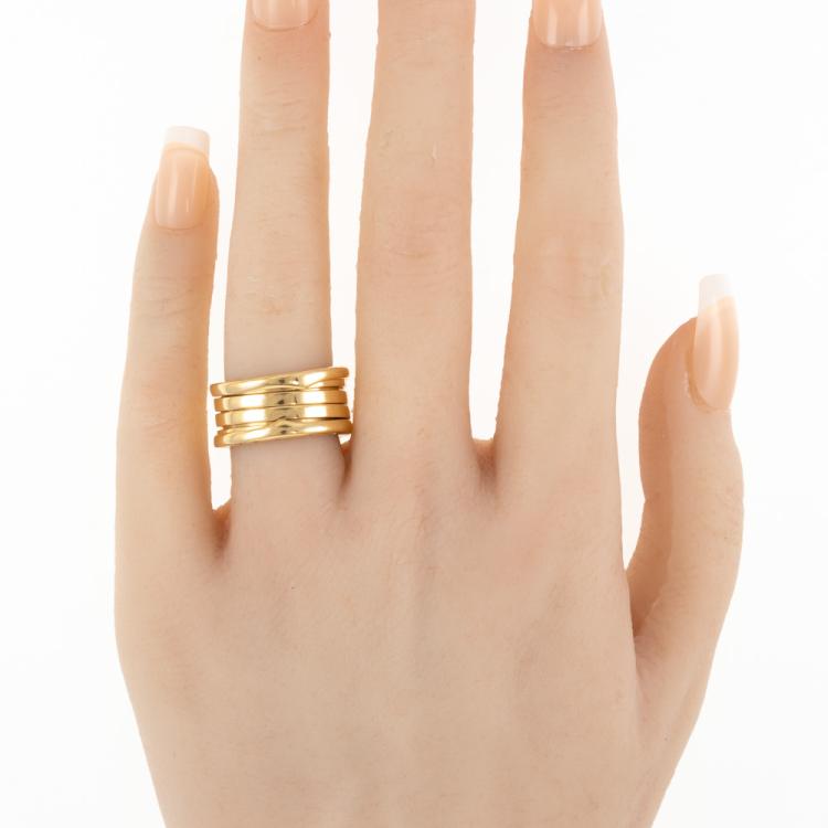 Bvlgari B.Zero1 four band ring. 18ct yellow gold. Bvlgari stamped size 51, actual size K1/2 - ring resizing is not recommend. Band width: 10mm. Made in Italy. Weight: 9.5g. With Bvlgari box. (Pre-owned)