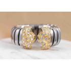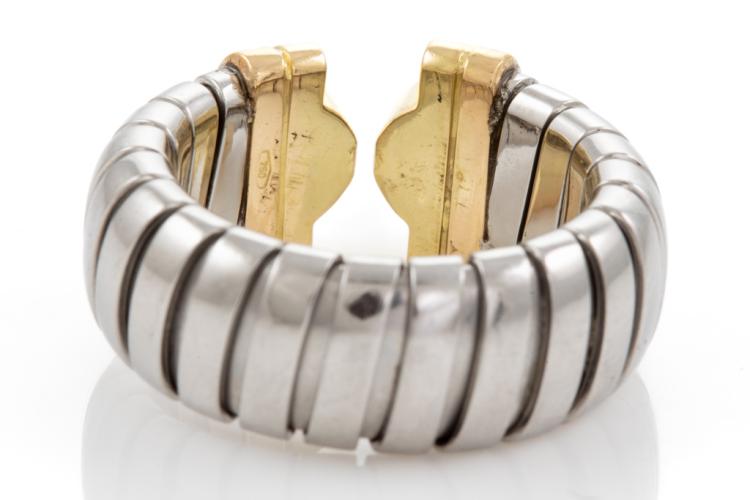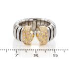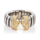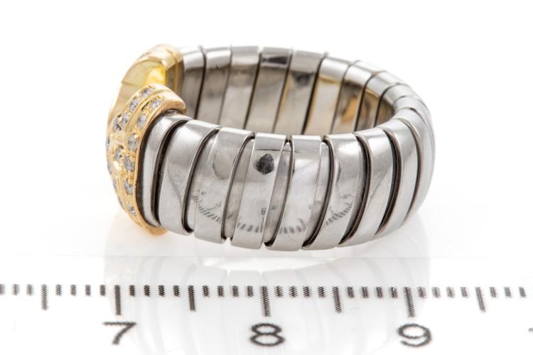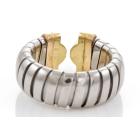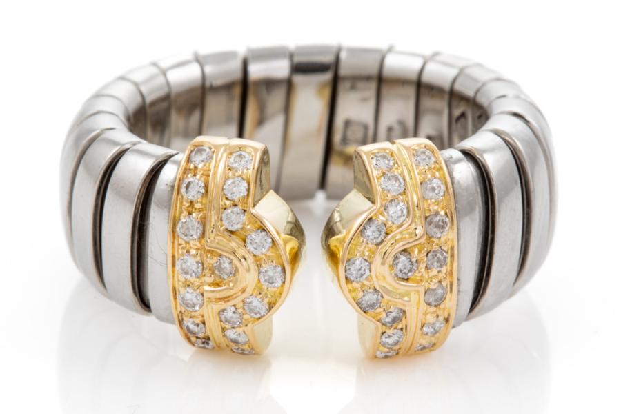 Bvlgari Bulgari Parentesi Tubogas Diamond ring with 34 round Natural Diamonds totalling 0.50cts (Estimated grading: G VS). 18ct yellow gold and stainless steel. Ring size L. Band width: 10.0mm- 8.30mm. Weight: 7.8g. (Pre-owned)
