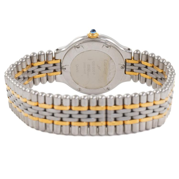 Cartier 21 Must De Cartier stainless steel and 18ct yellow gold quartz ladies watch. White dial, case diameter: 28mm, wrist size: 16.5cm, Swiss made. Ref# 125000P. With Cartier two tone bracelet and clasp. With Certificate of Authenticity. 3 month FSA warranty. (Pre-owned)