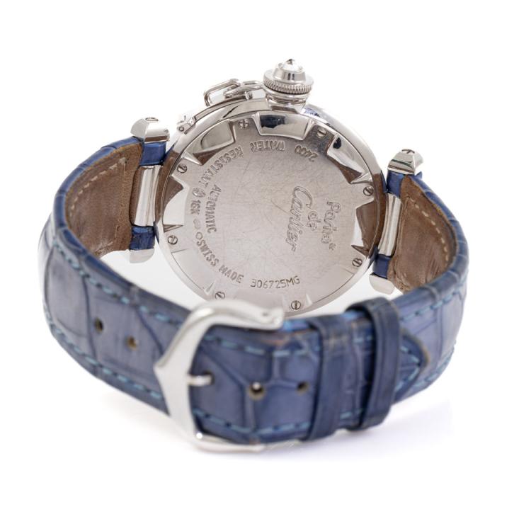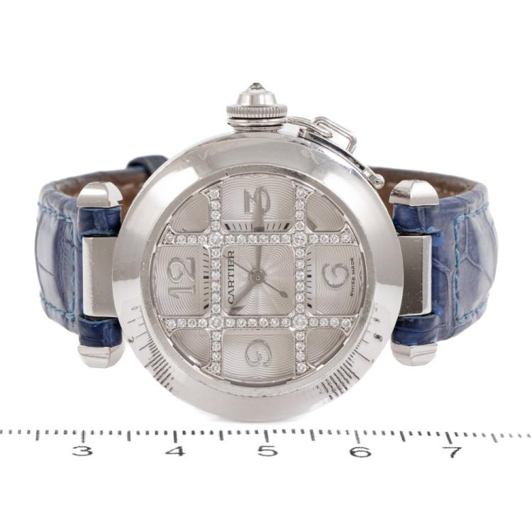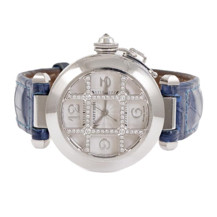 Cartier De Pasha Grille 18ct white gold automatic ladies watch. Silver dial with Diamond set grid, case diameter: 32mm, wrist size: 19cm, Swiss made. Ref# 2400. With Cartier blue leather bracelet (includes spare worn pink leather strap) and 18ct white gold clasp. With Certificate of Authenticity and Cartier box. 3 month FSA warranty. (Pre-owned)