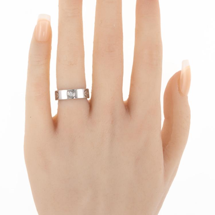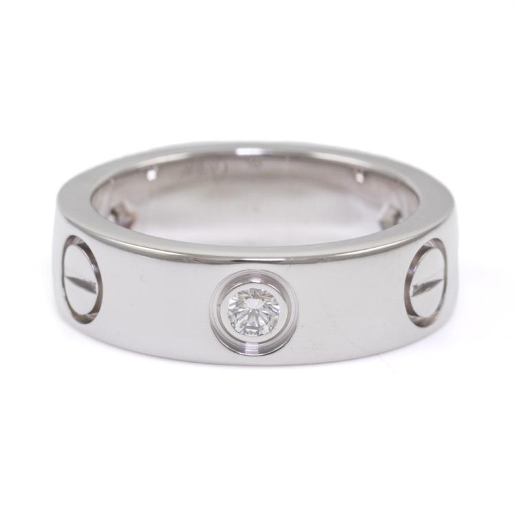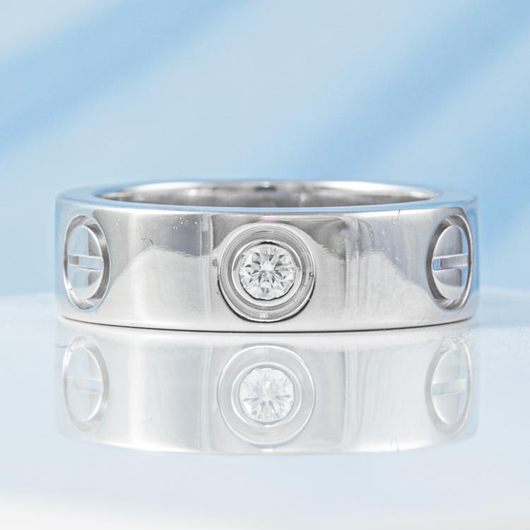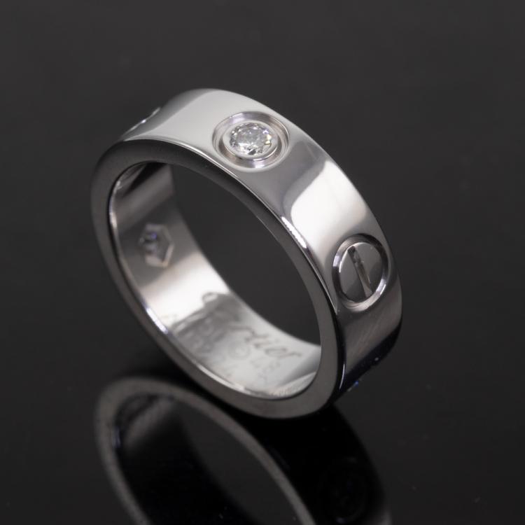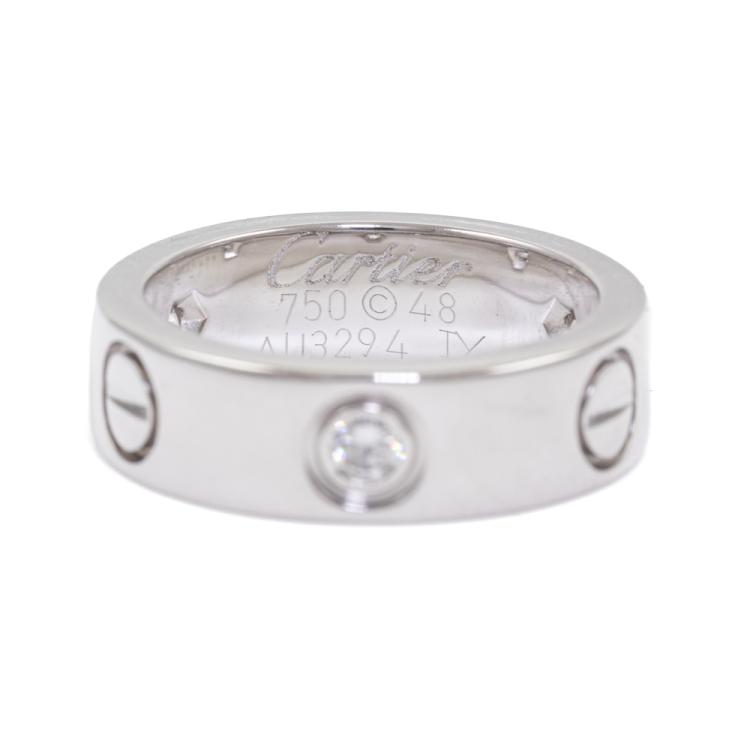 Cartier Love ring with 3 round Natural Diamonds totalling 0.22ct. 18ct white gold. Cartier stamped size 48, actual ring size I1/2 - ring resizing is not recommended. Band width: 5.5mm. Weight: 7.8g. (Pre-owned)