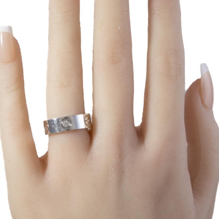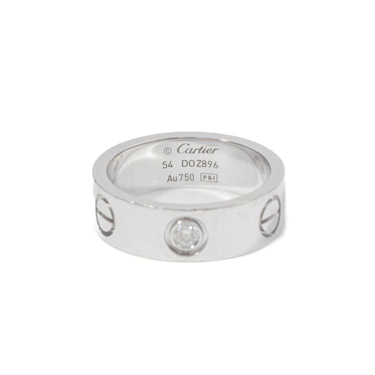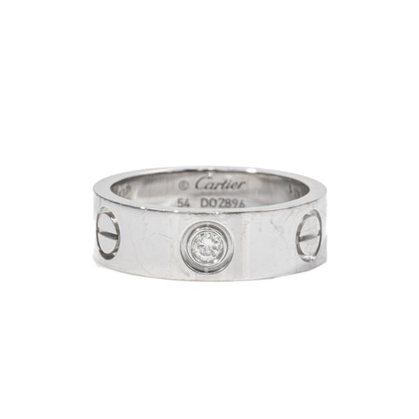 Cartier Love ring with a round Natural Diamond of approximately 0.07ct. Band width: 6mm. 18ct white gold. Cartier stamped size 54, actual size N1/2 - ring resizing is not recommended. Weight: 7.8g. (Pre-owned)